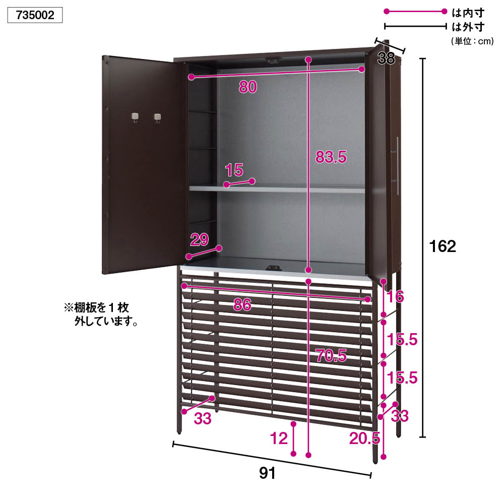 ■外寸:幅91奥行38高さ162cm、室外機スペース:幅86奥行33高さ70.5cm、収納庫内寸:幅80奥行29高さ83.5cm