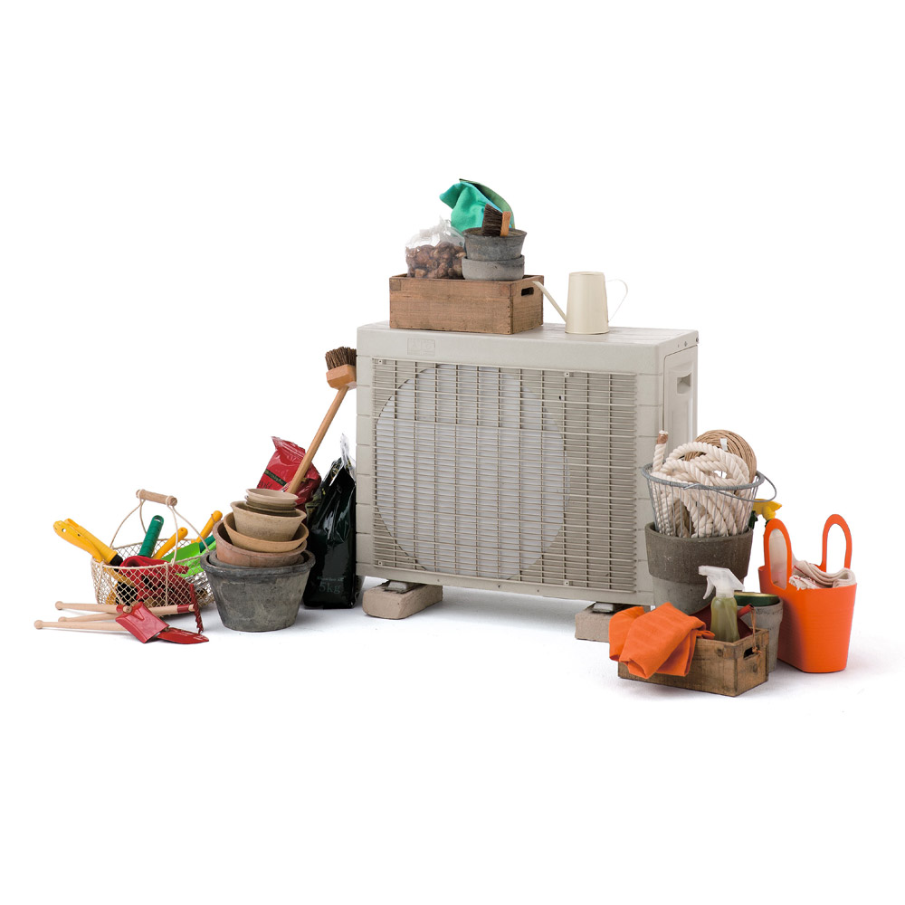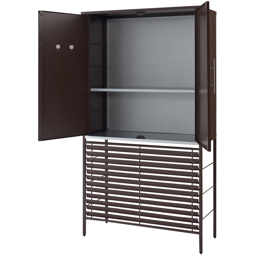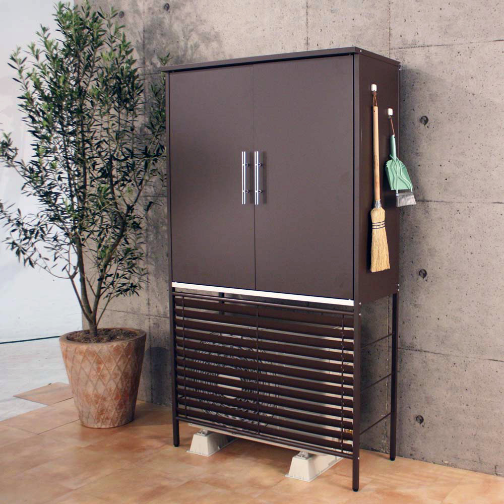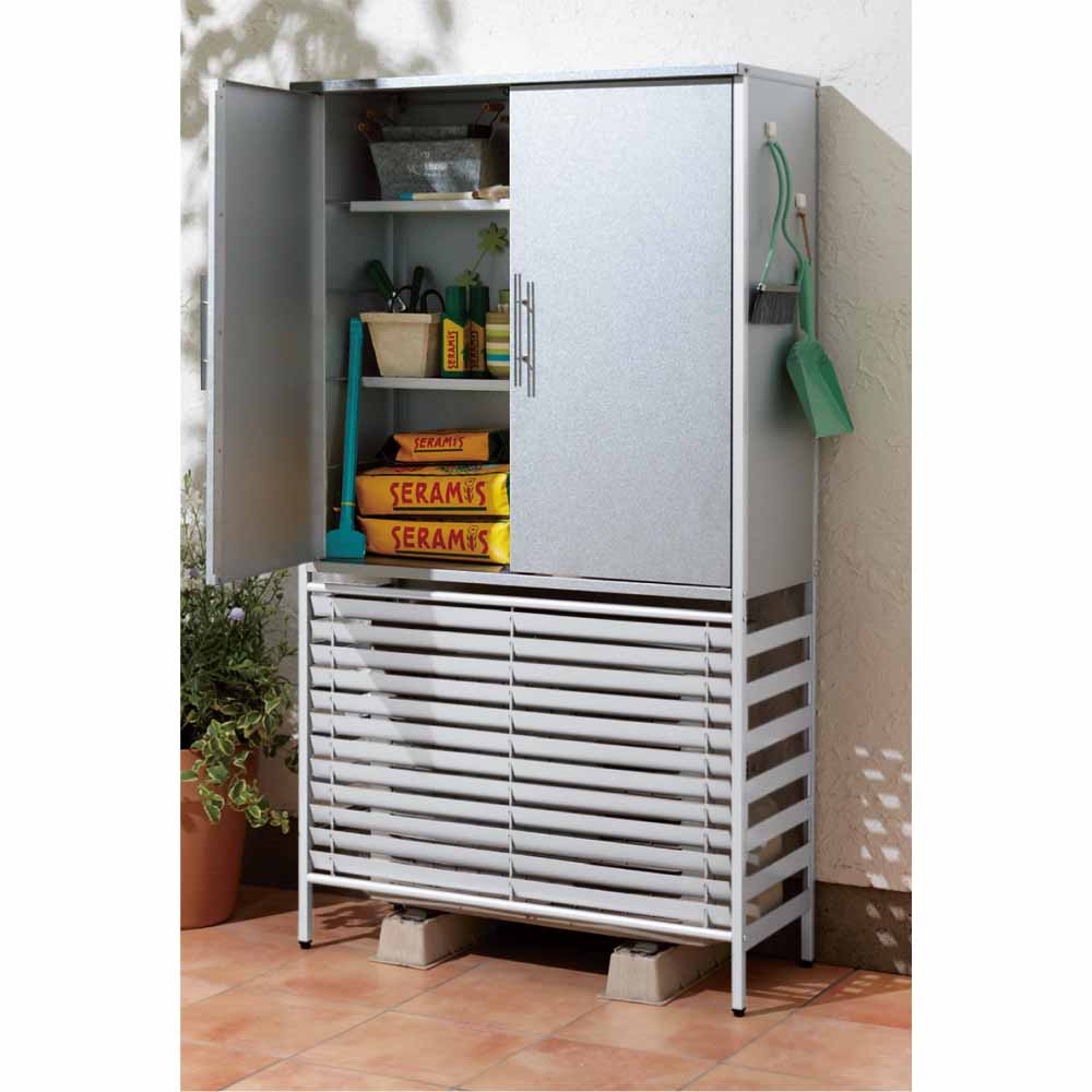 ・室外機カバー上部には物置をプラス。室外機を隠しながらデッドスペースを有効活用できます。・可動棚付きの本格的な収納庫で、あふれがちなガーデンツールや種、肥料などをまとめて収納できます。