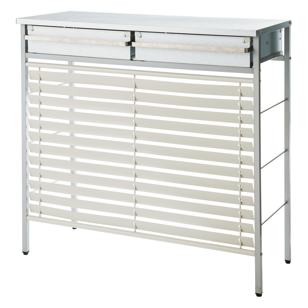■素材:天板…ガルバリウム鋼板、ルーバー・扉…ボンデ鋼板(メラミン焼付塗装)、フレーム…スチール(アクリル塗装)