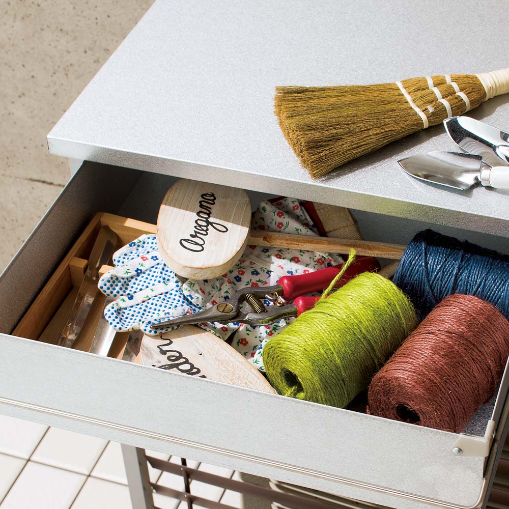 引き出しスペースには、サッと取り出して使いたい定番のガーデンツールをしまって。