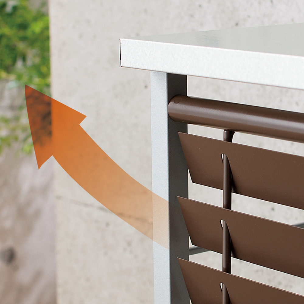・正面の逆ルーバーは、エアコン室外機からの熱風を上方に逃がします。・ベランダへ熱がこもるのを防ぐだけでなく、植物を守る効果も。