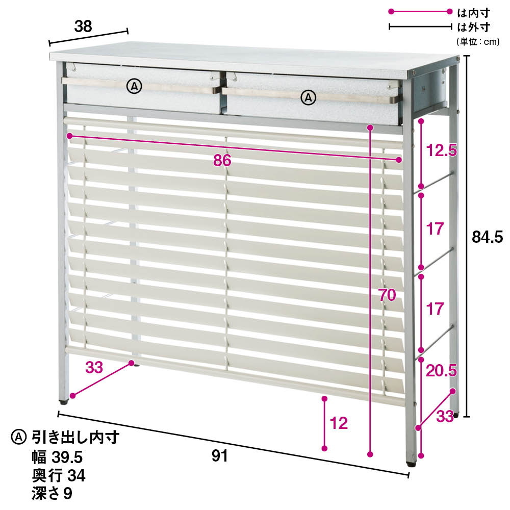 ■サイズ:幅91奥行38高さ84.5cm、引き出し内寸(1つあたり)…幅39.5奥行34高さ9cm、室外機スペース…幅86奥行33高さ70cm