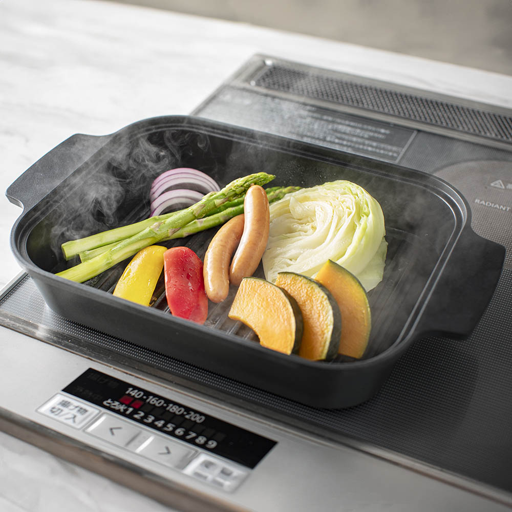この絶妙な長方形サイズが色々な料理を一度に焼くのに大変便利。お弁当作りにも便利に使えます。こちらは晩酌セット。厚揚げ、ブロッコリー、焼売を一気に焼いてそのまま食卓に!洗い物も減らせて本当に便利。カセットコンロやIHコンロにのせて焼きながら食べる、もOKです。