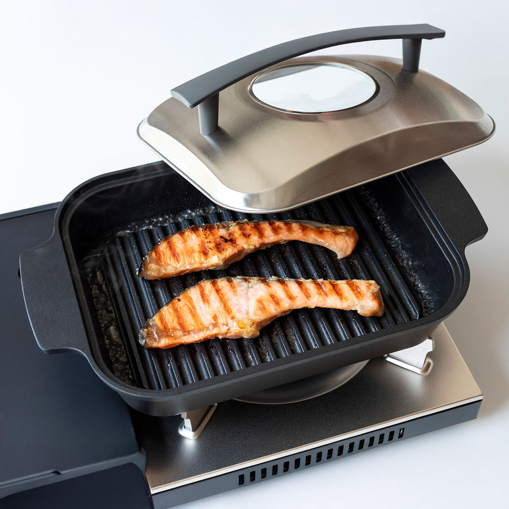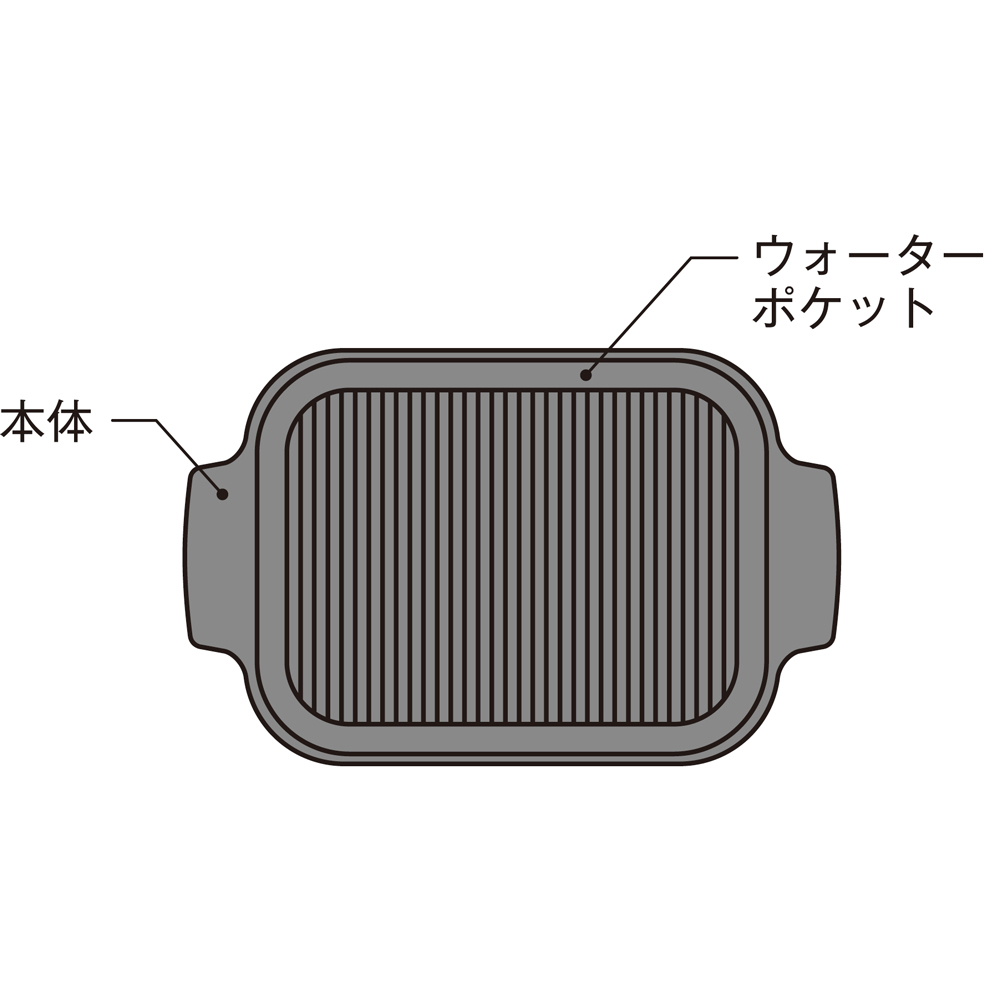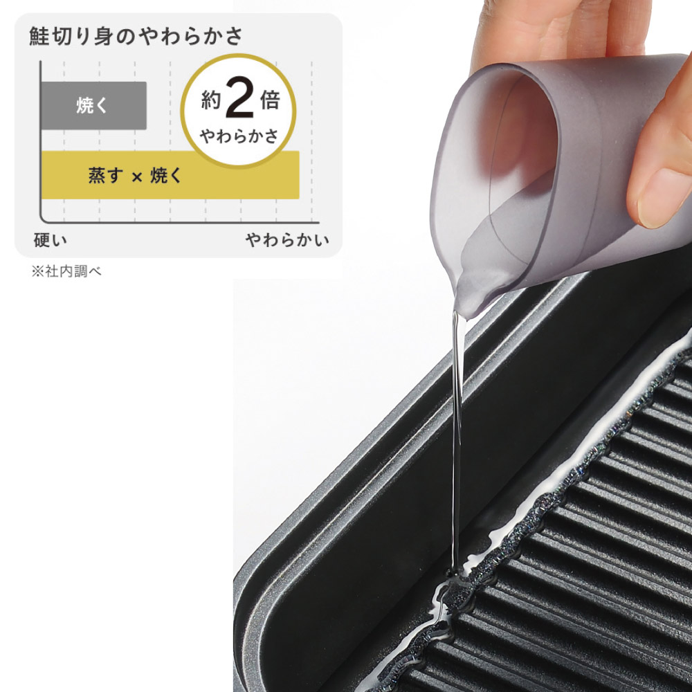 焼き面の周辺にはぐるっと囲う溝があり、そこに水を注ぐことで「蒸し+焼き」が可能に。蒸気で包み込むから食材の水分を逃さず、ふっくらやわらかい食感に焼き上げます。