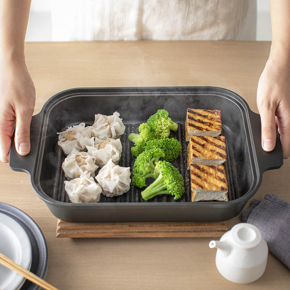 この絶妙な長方形サイズが色々な料理を一度に焼くのに大変便利。お弁当作りにも便利に使えます。こちらは晩酌セット。厚揚げ、ブロッコリー、焼売を一気に焼いてそのまま食卓に!洗い物も減らせて本当に便利。カセットコンロやIHコンロにのせて焼きながら食べる、もOKです。