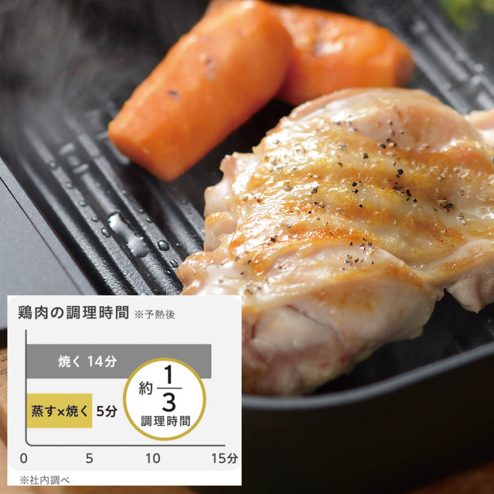 高温の蒸気がスチームグリルの内側にこもり、熱効率がアップ。食材に熱を通しやすくなり、調理時間は普通のフライパンで焼いたときと比べて約3分の1に。大幅な時短調理がかないます。