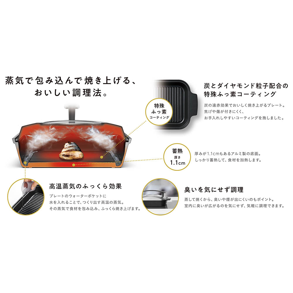蒸して焼くことでニオイや煙が出にくく、室内にニオイが広がるのを気にせず調理できます。また、プレートは特殊フッ素コーティングでお手入れも簡単。