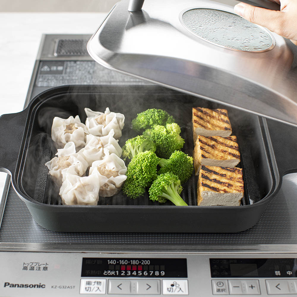 焼き面の周辺にはぐるっと囲う溝があり、そこに水を注ぐことで「蒸し+焼き」が可能に。蒸気で包み込むから食材の水分を逃さず、ふっくらやわらかい食感に焼き上げます。
