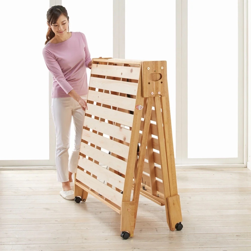 画像はシングルハイ ヘッドありタイプ(高さ45cm、床面まで36cm)です和室でも洋室でも活躍!ひのきすのこを使用した折りたたみ式ベッドお手持ちの布団を敷いてお使いいただけます。ほどよい高さがあるので立ち座りもしやすく、毎日の布団の上げ下ろしが大変な方にもおすすめです。