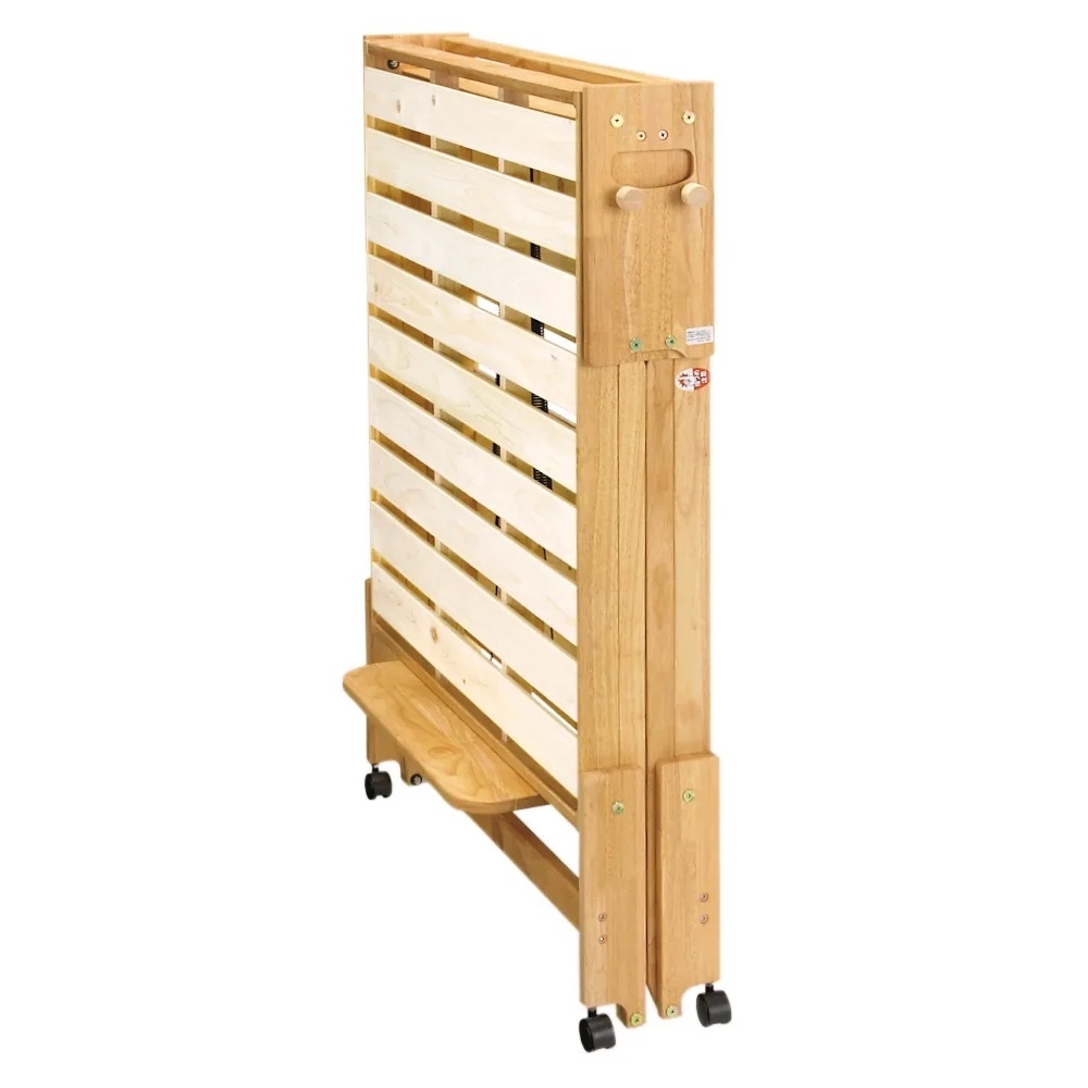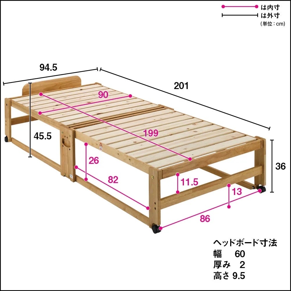 画像はシングルハイ ヘッドありタイプです折りたたむと幅わずか29cm!(ヘッドありタイプの場合)折りたたみ式で、起きたらたたんで収納できるのでお部屋を広く使えます。お掃除もラクラク。普段は収納しておき、お客様のお泊り時に使用しても便利です。ヘッドなしタイプは、折りたたむとさらにスリムな幅19cmに。