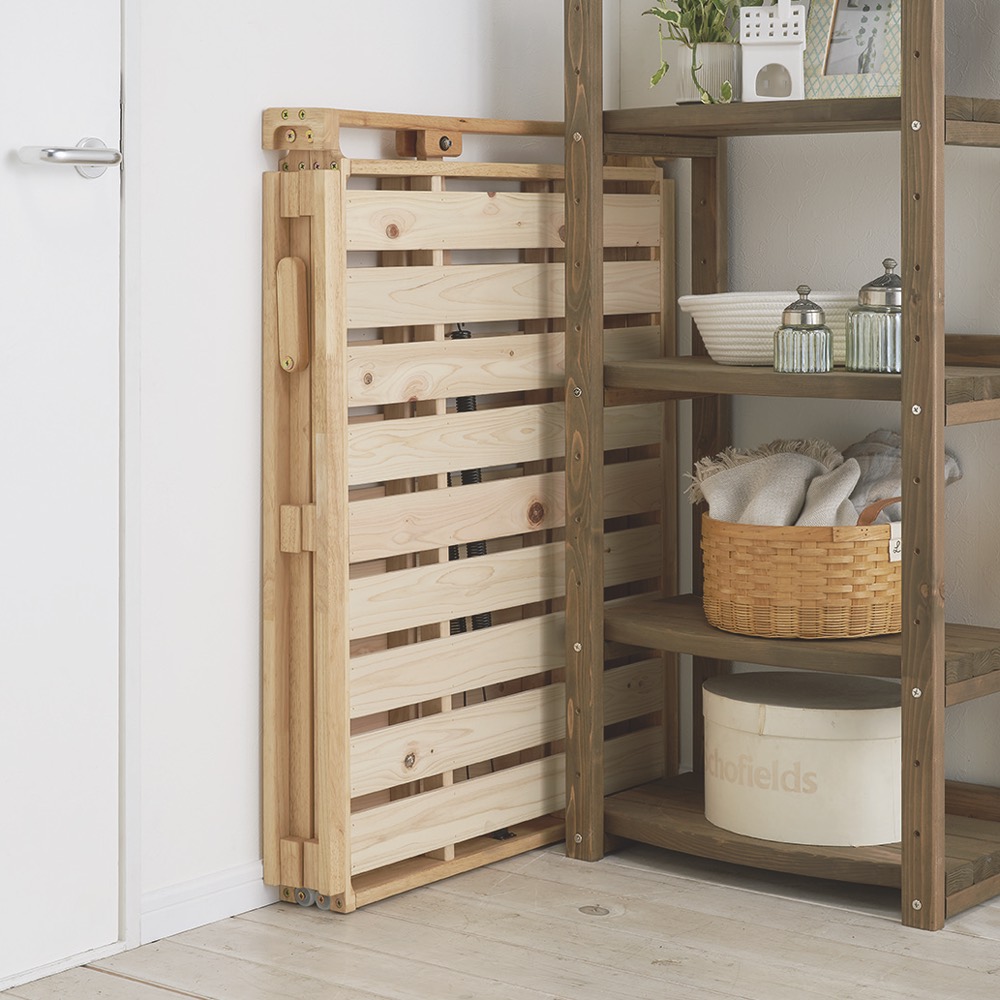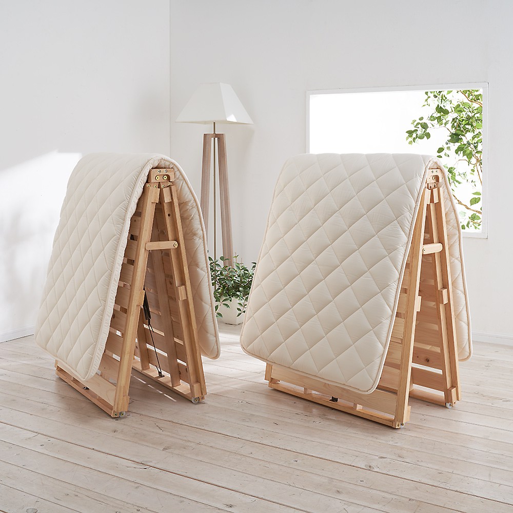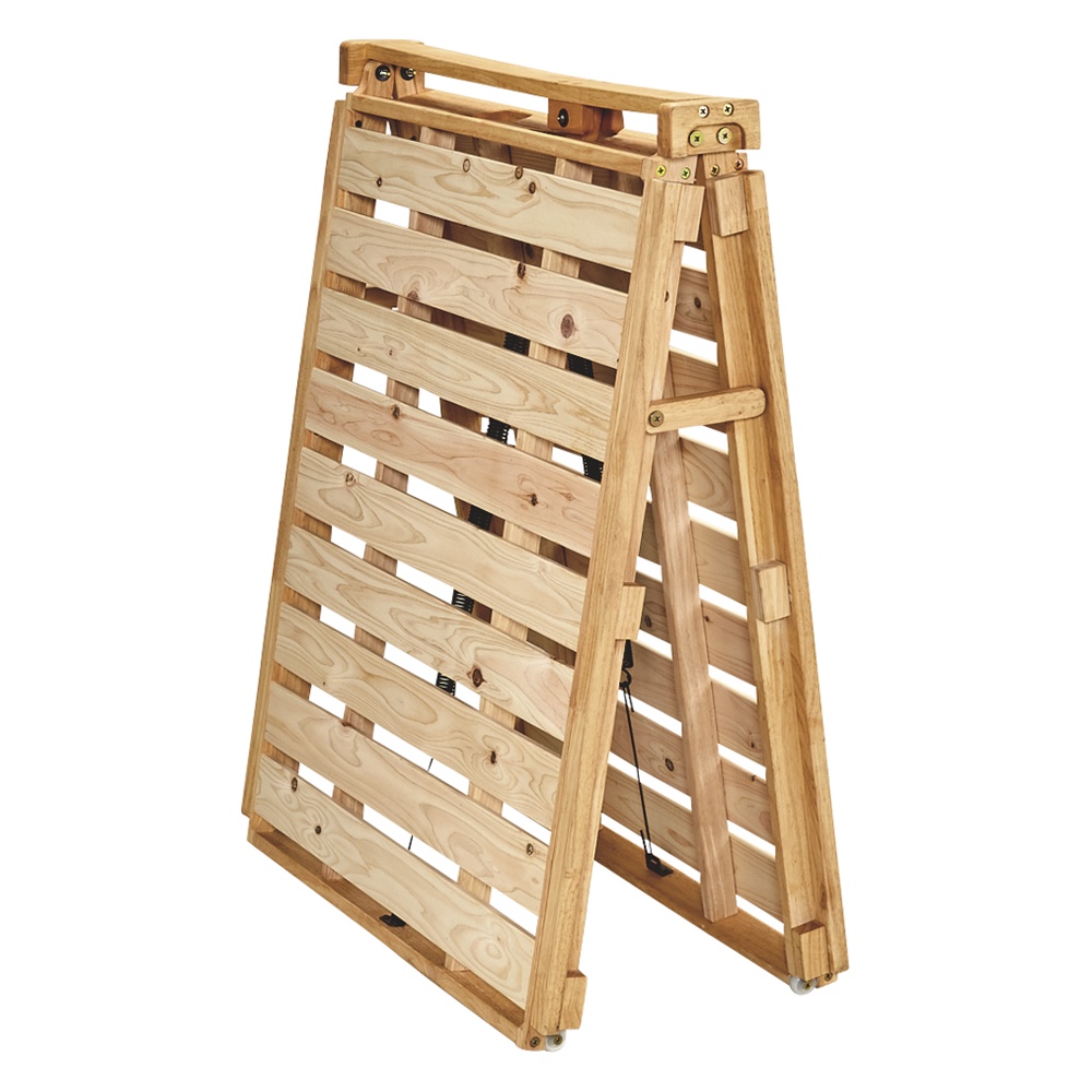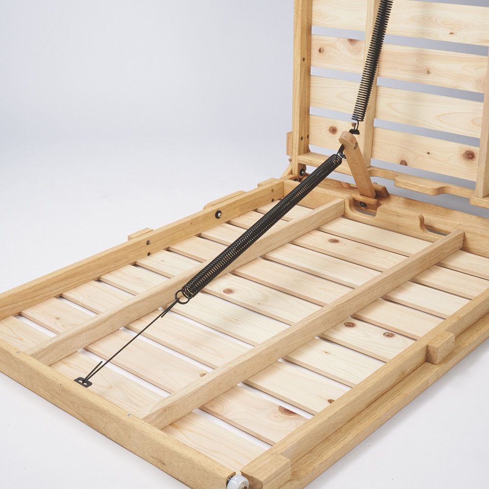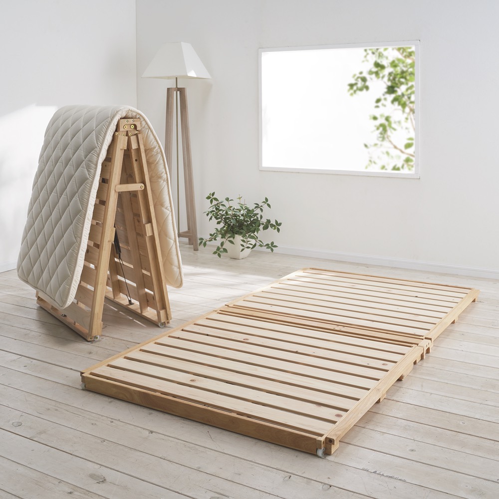 ●布団派の方におすすめ湿気・カビ対策に通気性がよい日本製ひのきすのこベッド。●バネの力とキャスターで、折りたたみの操作は軽々!