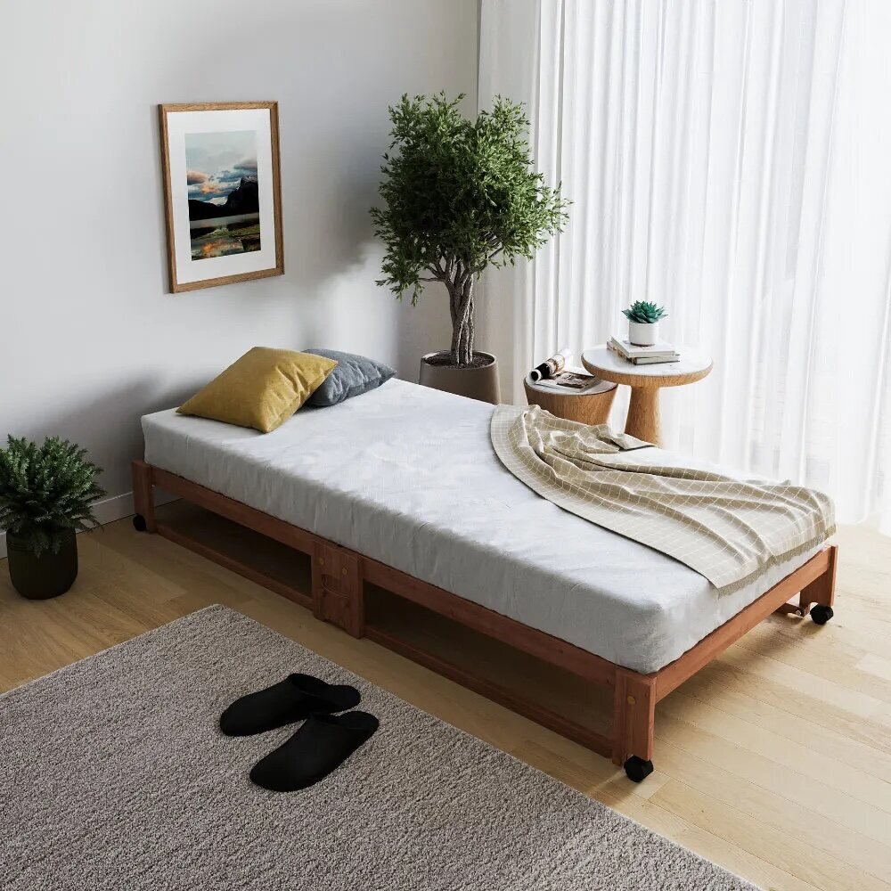 床や畳を傷めにくい構造ですベッドにした時にキャスターだけでなくフレーム全体が床につくので、荷重が分散され床や畳を傷めにくいフレーム構造です。キャスターにストッパーがなくても滑りにくくなっています。また、取っ手部は床面と高さが揃っているので、布団を敷いても邪魔にならない設計です。