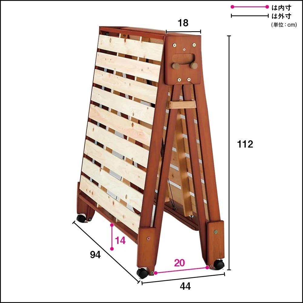 画像はシングルハイ ヘッドありタイプです折りたたむと幅わずか29cm!(ヘッドありタイプの場合)折りたたみ式で、起きたらたたんで収納できるのでお部屋を広く使えます。お掃除もラクラク。普段は収納しておき、お客様のお泊り時に使用しても便利です。ヘッドなしタイプは、折りたたむとさらにスリムな幅19cmに。