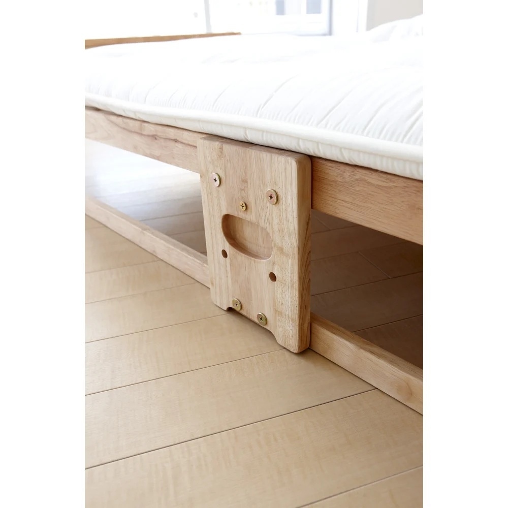 床や畳を傷めにくい構造ですベッドにした時にキャスターだけでなくフレーム全体が床につくので、荷重が分散され床や畳を傷めにくいフレーム構造です。キャスターにストッパーがなくても滑りにくくなっています。また、取っ手部は床面と高さが揃っているので、布団を敷いても邪魔にならない設計です。