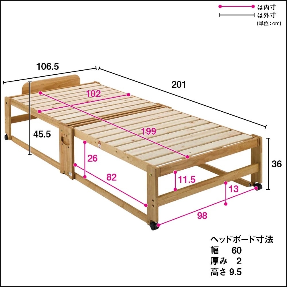 画像はシングルハイ ヘッドありタイプです折りたたむと幅わずか29cm!(ヘッドありタイプの場合)折りたたみ式で、起きたらたたんで収納できるのでお部屋を広く使えます。お掃除もラクラク。普段は収納しておき、お客様のお泊り時に使用しても便利です。ヘッドなしタイプは、折りたたむとさらにスリムな幅19cmに。