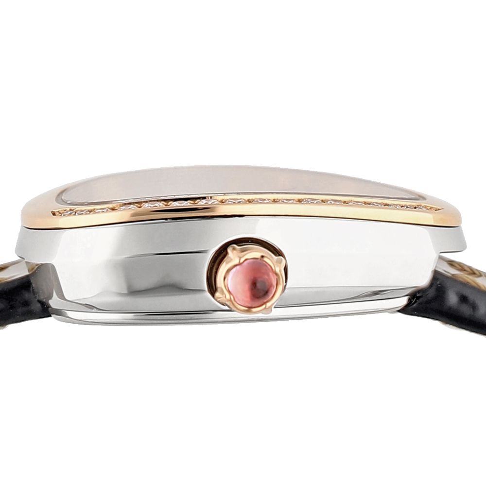 K18PGのベゼルにダイヤをセットした小ぶりなケース、ギョーシェ模様の文字盤も気高くエレガントな時計。2重巻きベルトは、メタリックブロンズとレッドの2種類が付き、付け替えも簡単です。商品画像の説明