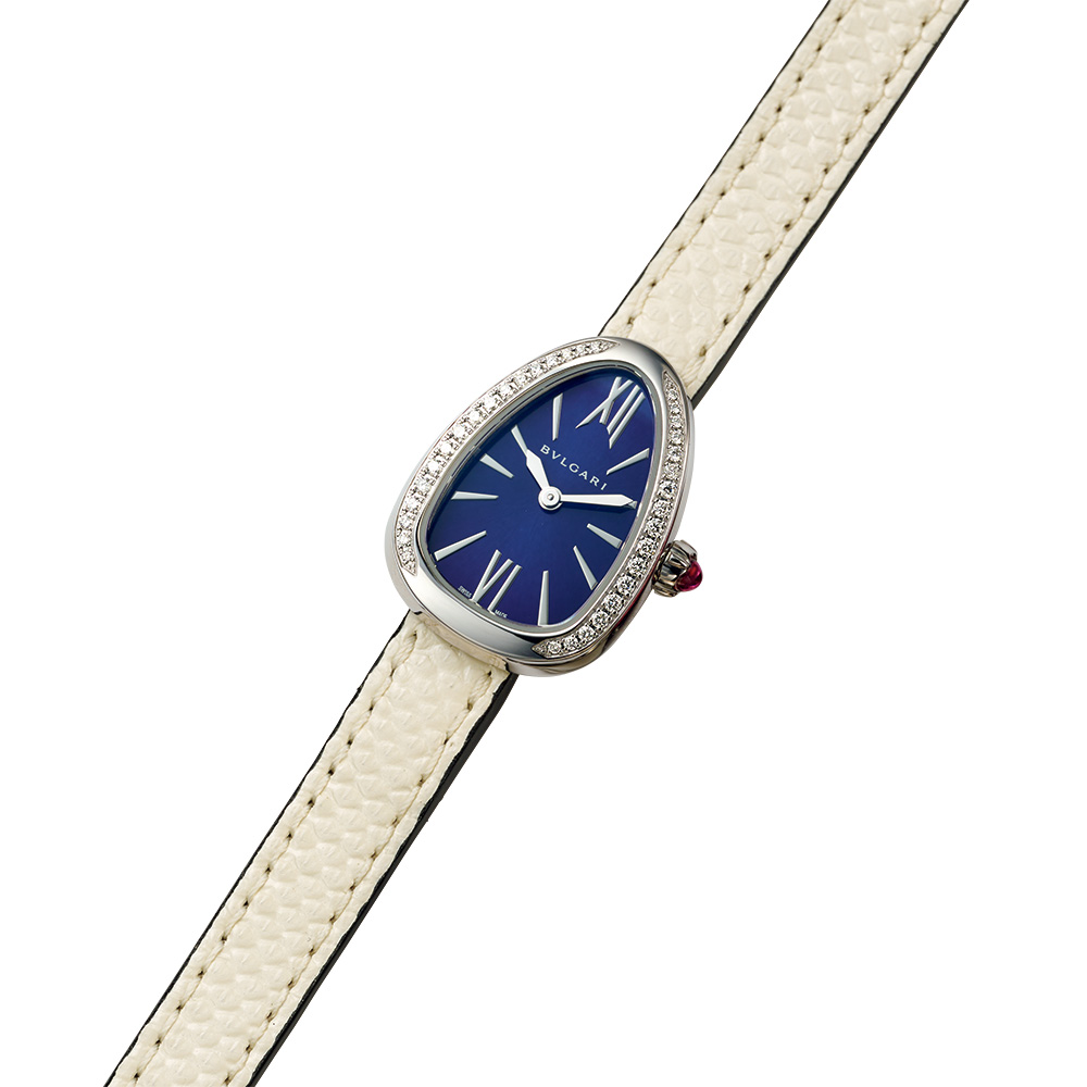 何度でも、美しく生まれ変わるスネークは、 「幸運」と「再生」の化身。「ブルガリ」を代表するアイコン「セルペンティ」の時計は、ダイヤで取り巻いたドロップ形の小さなケースと、スパイラルベルトでスネークをモダンに再構築。文字盤に合わせたロングベルトに加え、2種類のベルトがついています。商品画像の説明