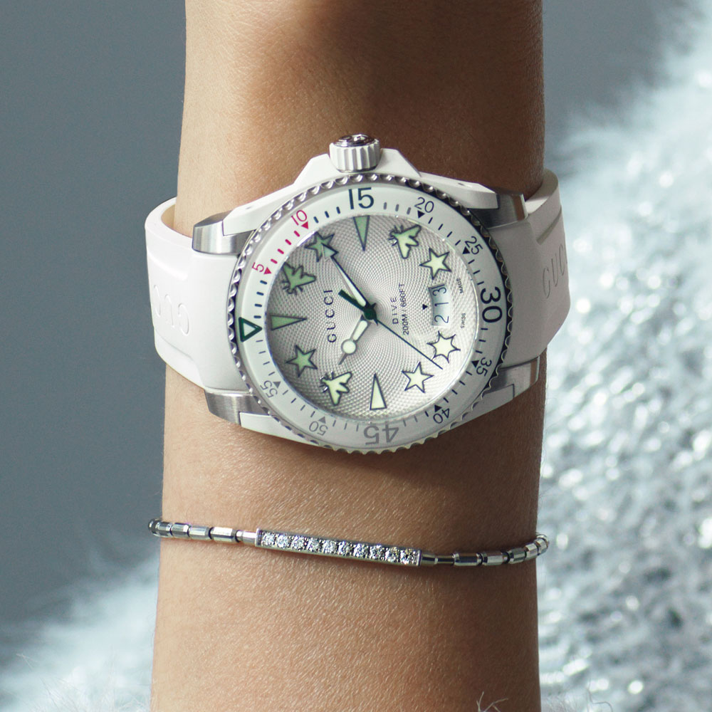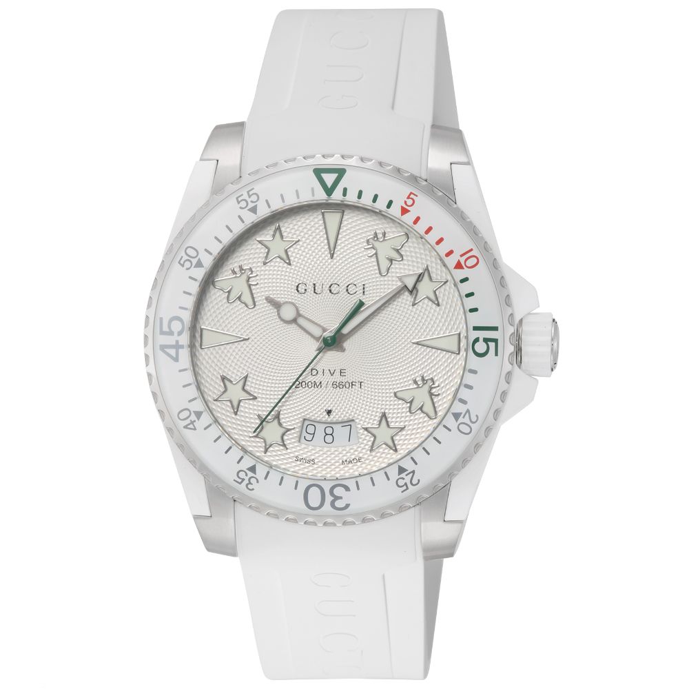時間をマネジメントするだけでなく美意識をも明確に示す時計。今の自分らしさを託すにふさわしい手元のパートナーを探しませんか?いきいきと自由に日々を楽しむライフスタイル観にマッチするラグスポ時計。20気圧防水を備えた「グッチ ダイブ」。文字盤のモチーフが利いた40mmのユニセックスモデルを、繊細なギョーシェ加工やクリーンなホワイトカラーでリュクス&モードに導いているのが大人好み。