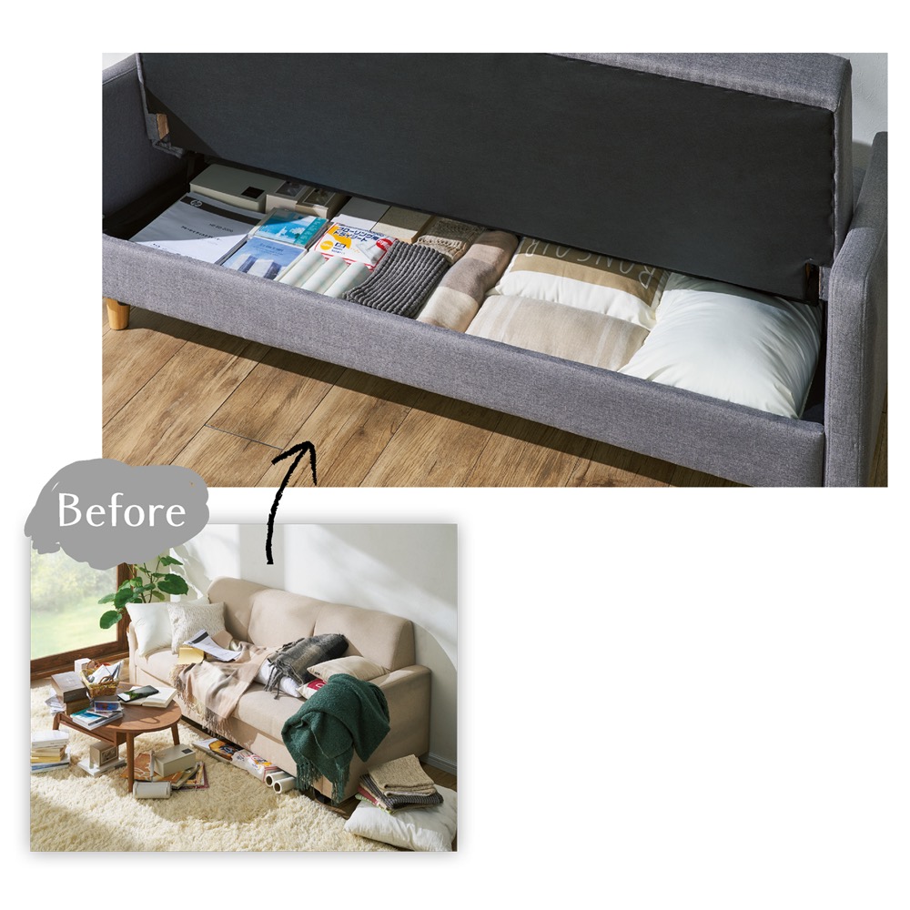 【いち推し!ポイント】リビングまわりの散らかる物はソファの下にしまっちゃお!片づけのコツは「使う場所の近くにしまう」こと。家電の取説やソファで使うカバー類が見事に片づきます。