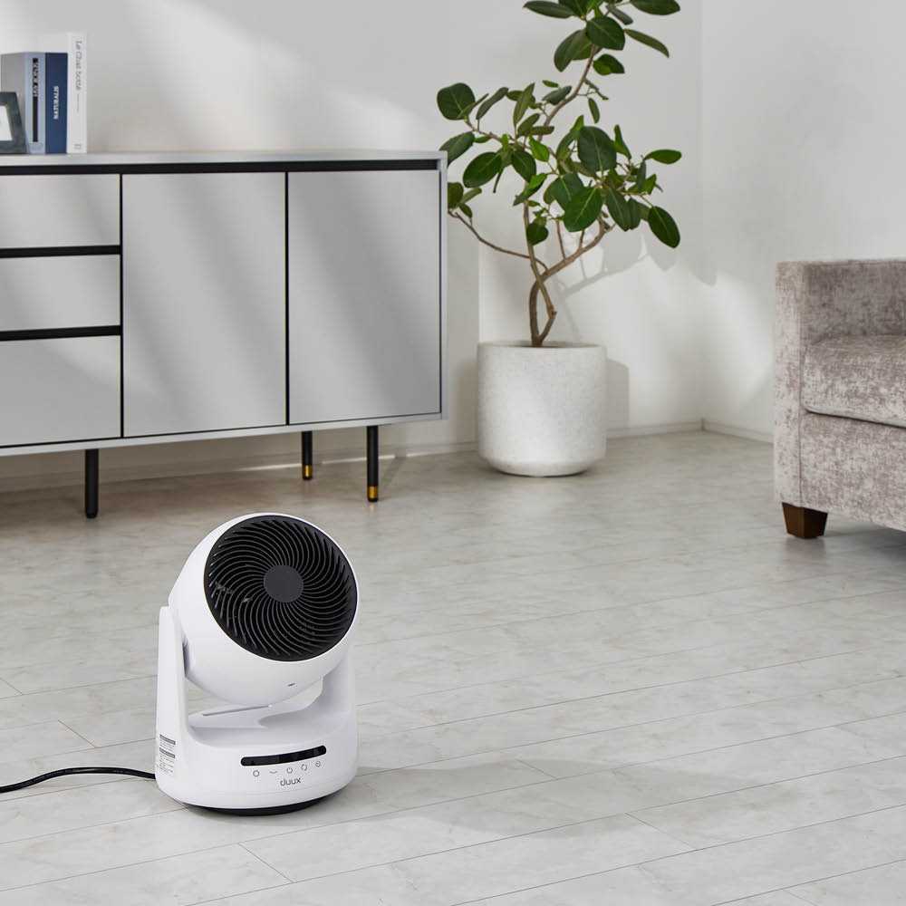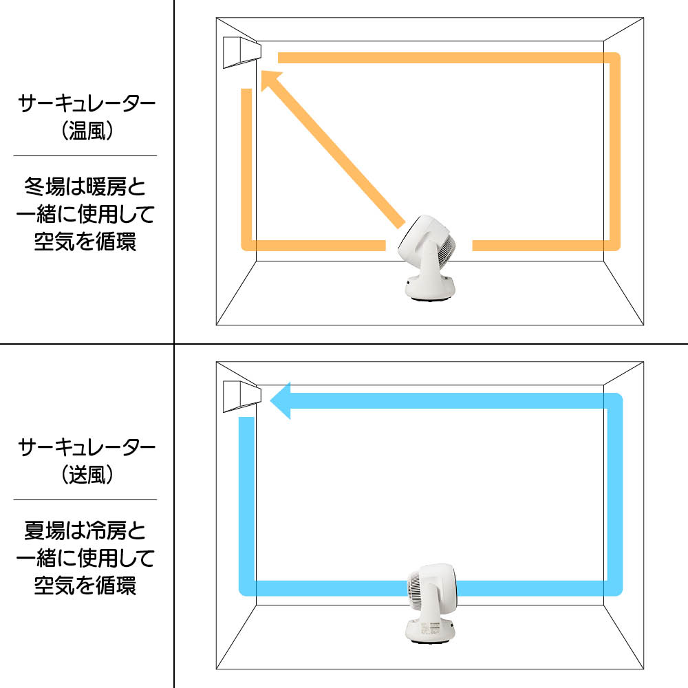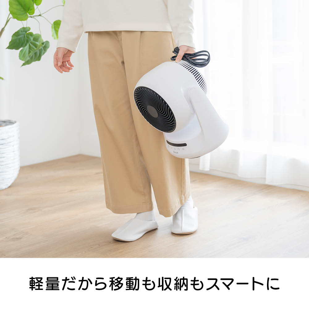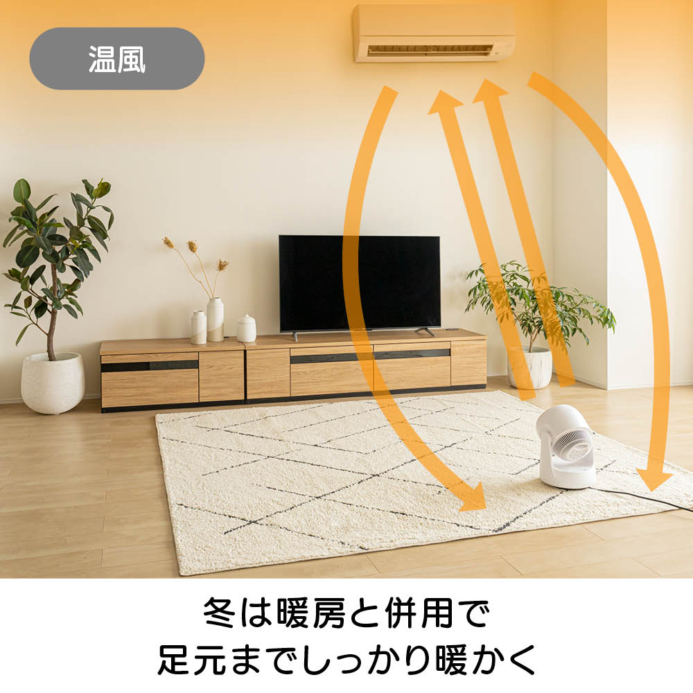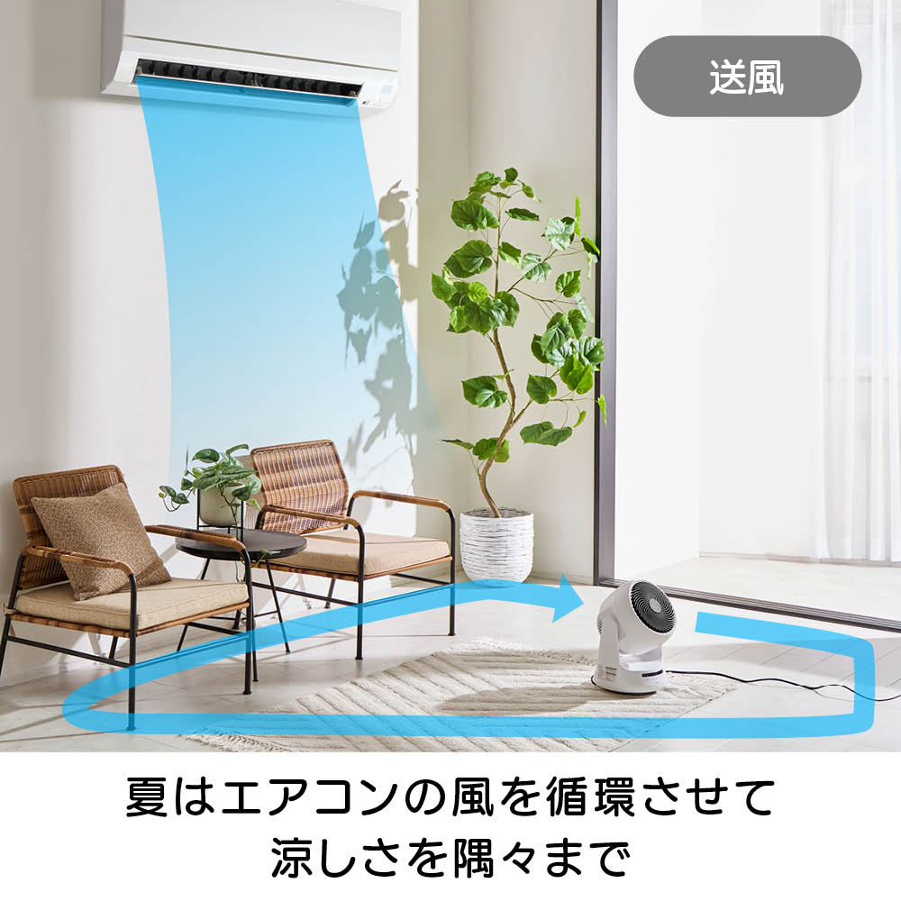 夏も冬も過ごしやすく。温度ムラを抑えて一年中快適に夏はエアコンを背にして送風し足元の冷気を循環させ、冬はエアコンに向けて温風を送って上にたまった暖気を循環させる使い方がおすすめ。季節を問わず使えるこの一台があれば、部屋全体の温度ムラを解消し、一年中快適にお過ごしいただけます。