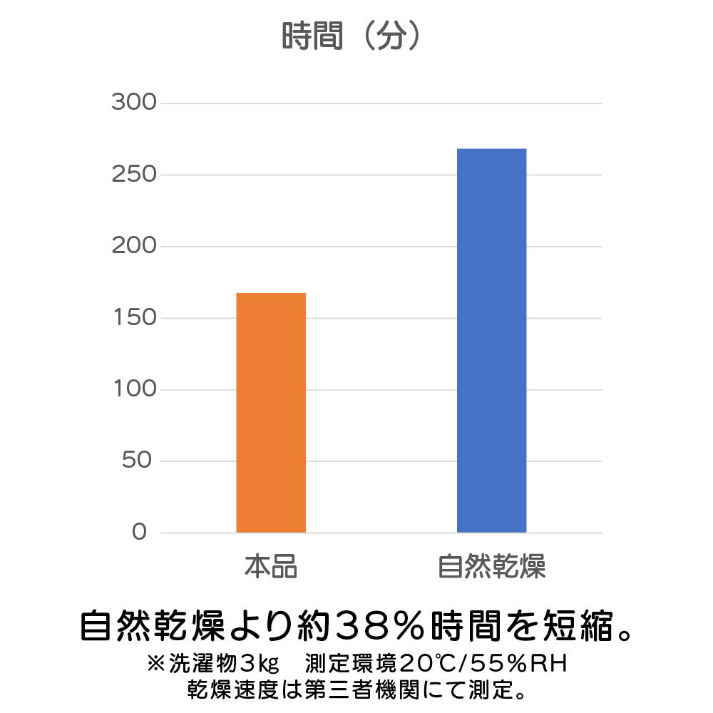 冬や花粉の季節も、部屋干しをスピーディーに乾燥冬場や花粉の季節は部屋干しにも大活躍。「衣類乾燥機能」を使えば、60°の角度から温風を効率よく送り込み、自然乾燥に比べ約38%※の時間を短縮できます。天候や季節を気にせず、衣類をしっかり乾かせます。※乾燥速度は第三者機関調べ