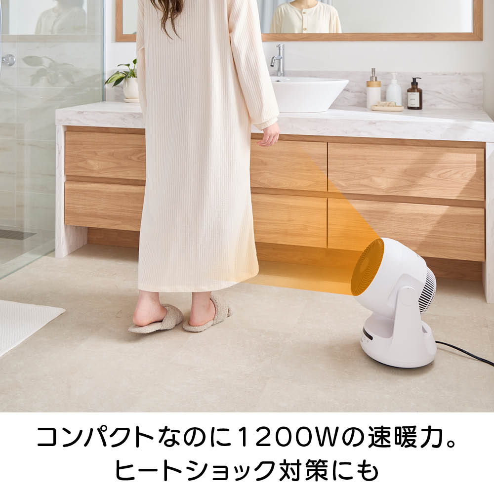 温風・送風の2Way機能。冬場は衣類乾燥やスポット暖房にも夏は送風でエアコン効率を高め、冬は1200Wの温風で衣類乾燥やスポット暖房に。脱衣所など冷える場所も暖められ、オールシーズン活躍します。