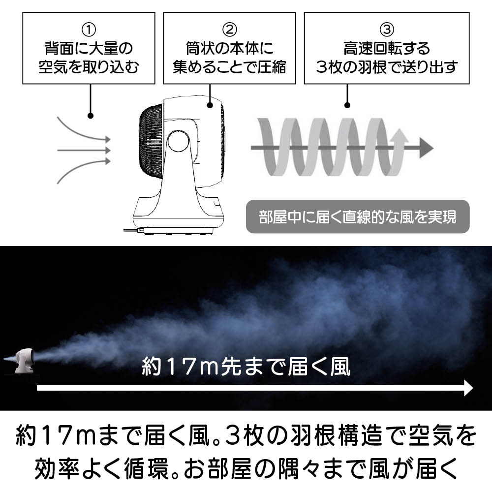 お部屋の隅々まで風が届く3枚の羽根構造が空気を効率よく集め、勢いよく送り出すことで、お部屋の空気をしっかり循環。最大17m先まで風が届きます。だから部屋のどこにいても一年中快適な温度で過ごせます。