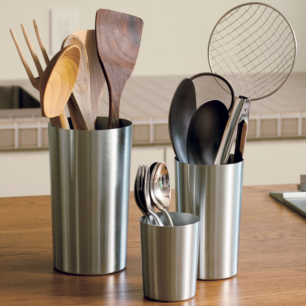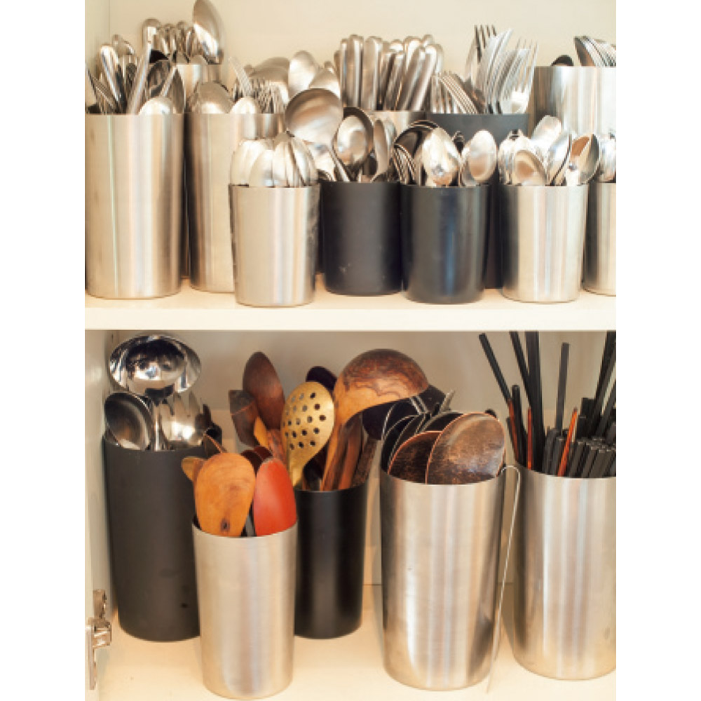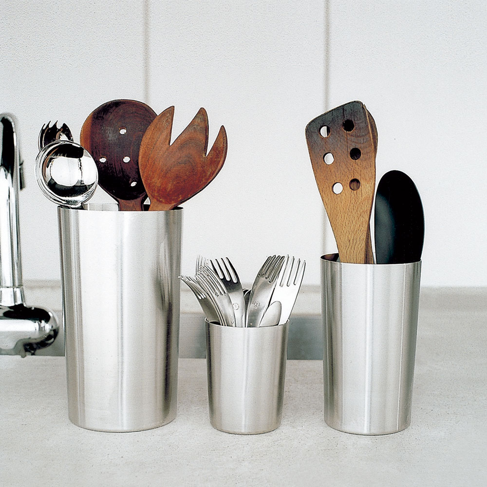 清潔感があって美しいステンレス製であること。大きなコップのようなシンプルな形であること。重いキッチンツールを入れても倒れにくいこと。この3つの条件を満たすものを探したところ「本当にないんです。それでメーカーと共同開発をしてみて、巷になかった理由がわかりました。作るのがとっても大変なの」底に重りの入ったツールスタンドは安定感がよく、たくさん入って、見た目もおしゃれ。