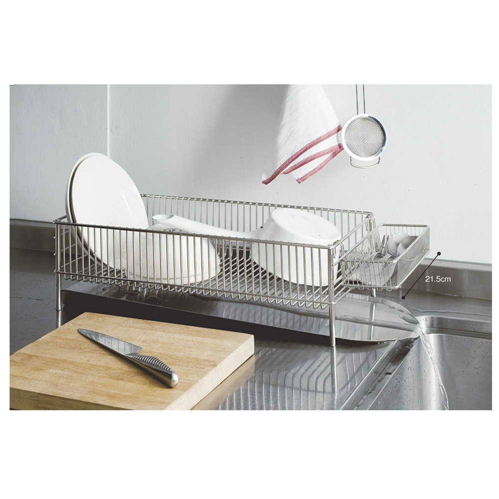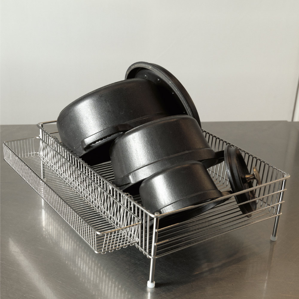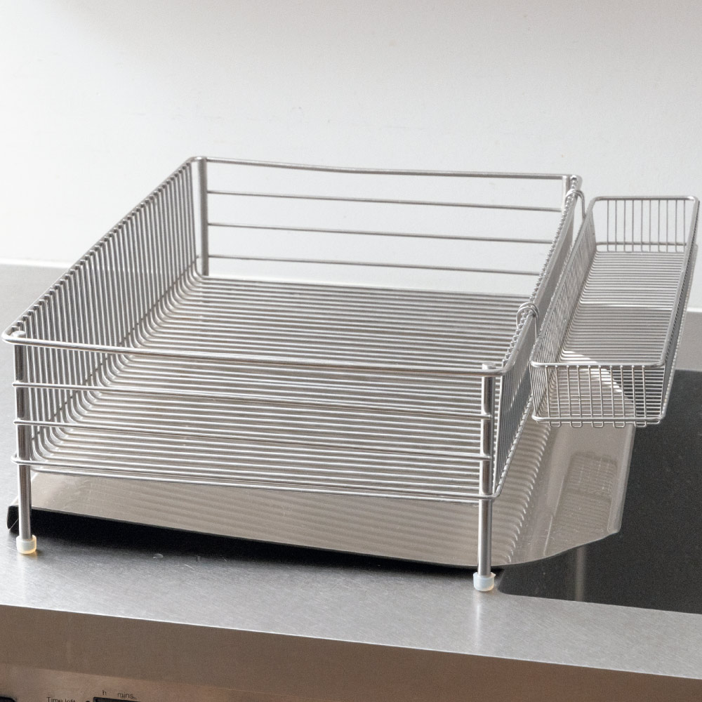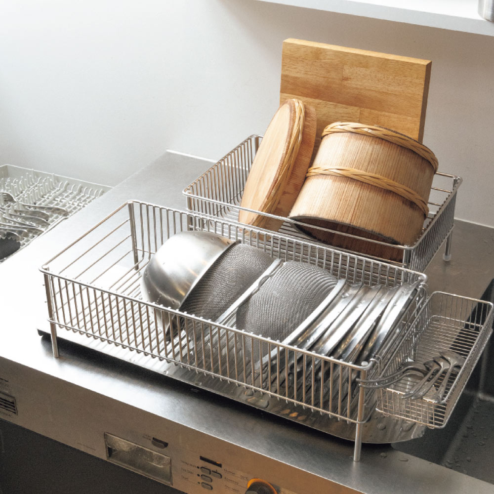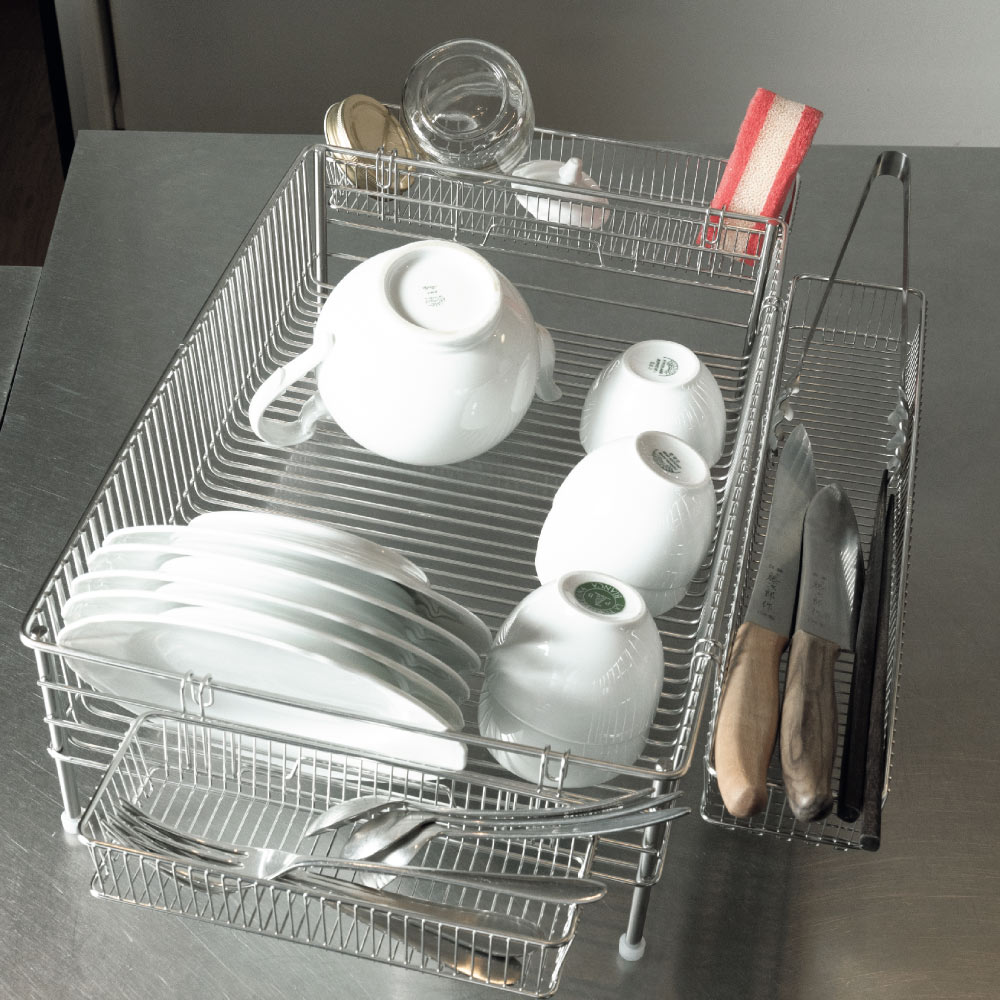 底に溶接部分が無いので汚れがたまらず、清潔を保ちやすい形状。かごの深さを浅めにする事によって、食器の出し入れがしやすくなりました。底はワイヤーが縦にまっすぐ通っているだけのシンプルなデザインで、ワイヤーのピッチが細かくフラットなので、皿が立てやすく、グラスを置いた時の安定性に優れています。さらにワイヤー間隔の細かい専用のポケットを使えば、箸や調理ベラ、小さな道具を分別できます。(2)衛生を保ち、永く使える