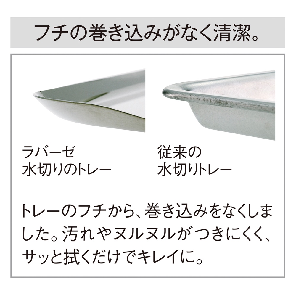 ラバーゼの水切りかごに使用されている18-8ステンレス素材は、サビにくく、水と反応してにおいを分解する特徴があり、非常に衛生的な素材です。さらに、トレーが斜めに傾いているので洗い物の水がトレーにたまらず、自然にシンクに流れ落ちます。トレーのフチには巻き込みが無いので汚れがたまりににくく洗いやすいので常に清潔を保てます。洗い物が終わったらトレーを布巾でさっと一拭きするだけと、お手入れも簡単です。■la baseについて