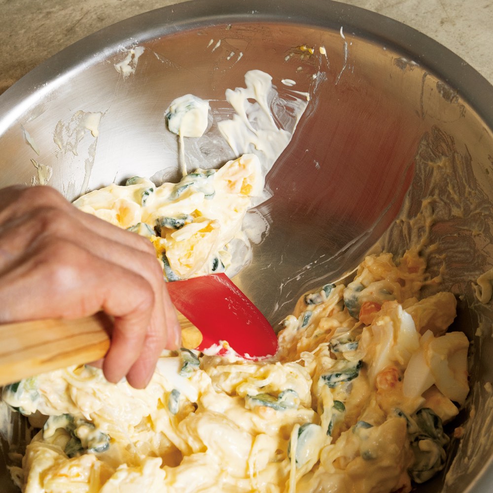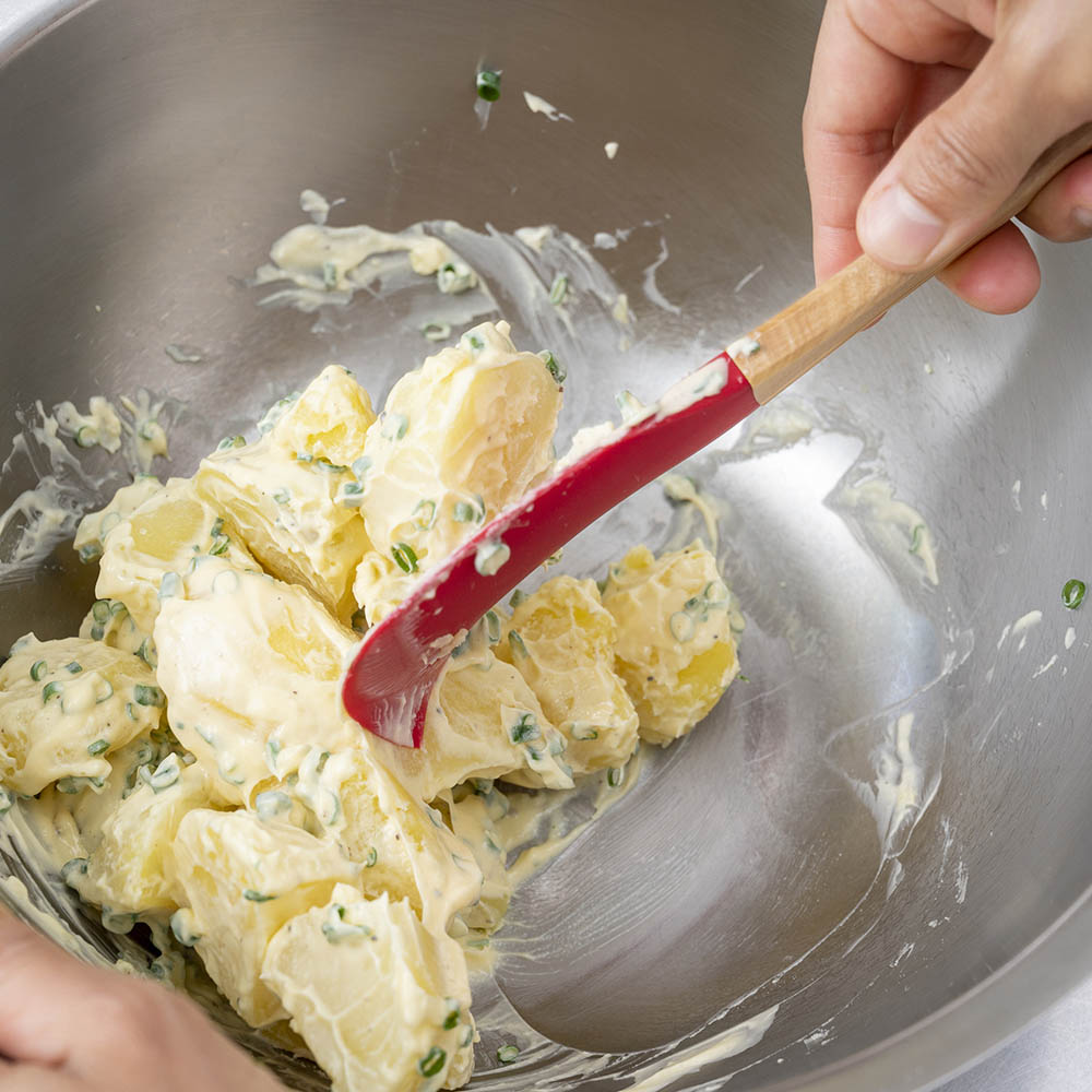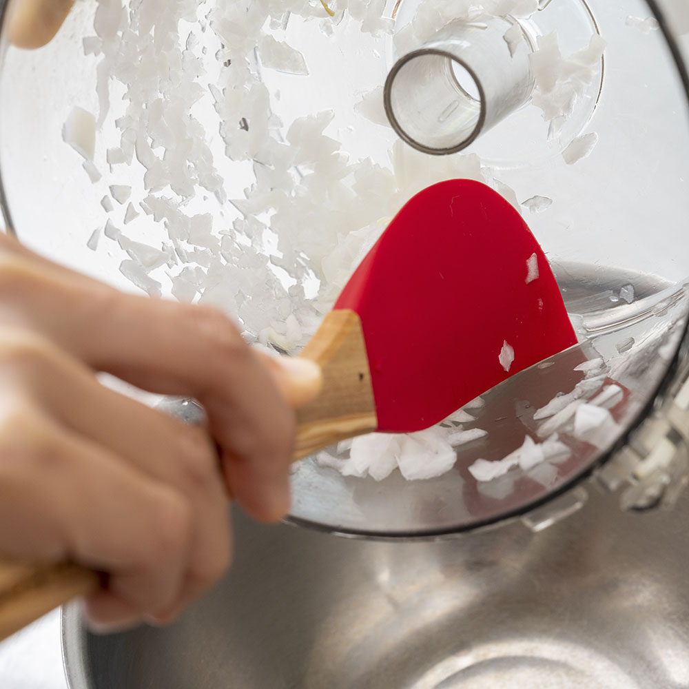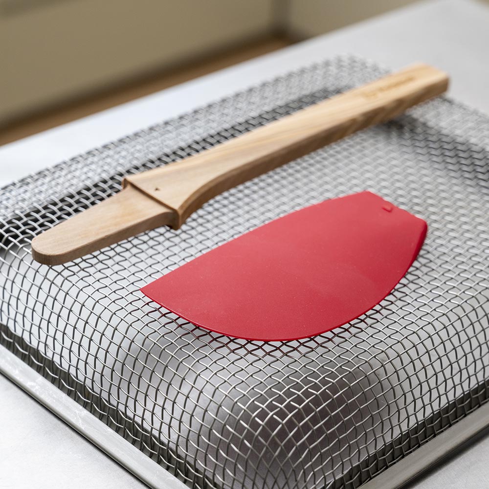 シリコーンヘラは「1日のうちに何十回も使う道具」と語る有元さんは理想のシリコーンヘラを作るため、まずはカタチにこだわりました。日本はもちろん海外のゴムベラも探し、日本では売られていない滑らかなカーブのものを見つけましたがそれも満足できるものではなく、そのヘラを自らハサミで切り、カタチをみたりすることも。開発が進み、試作を使っては改善を繰り返し、構想から3年以上の時を経て、ボウルやフライパンにフィットするなめらかなカーブと、容器の角までしっかり取れる90度の先端をもったシリコーンヘラが誕生しました。