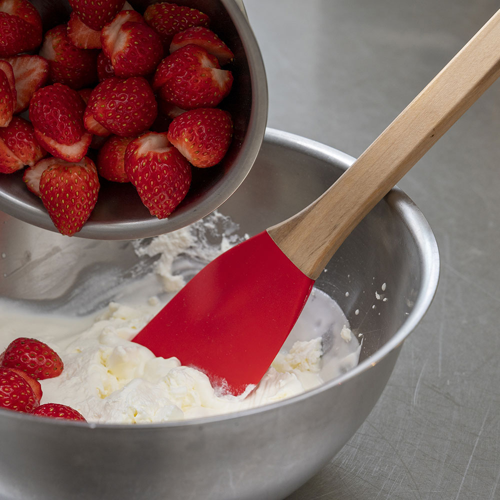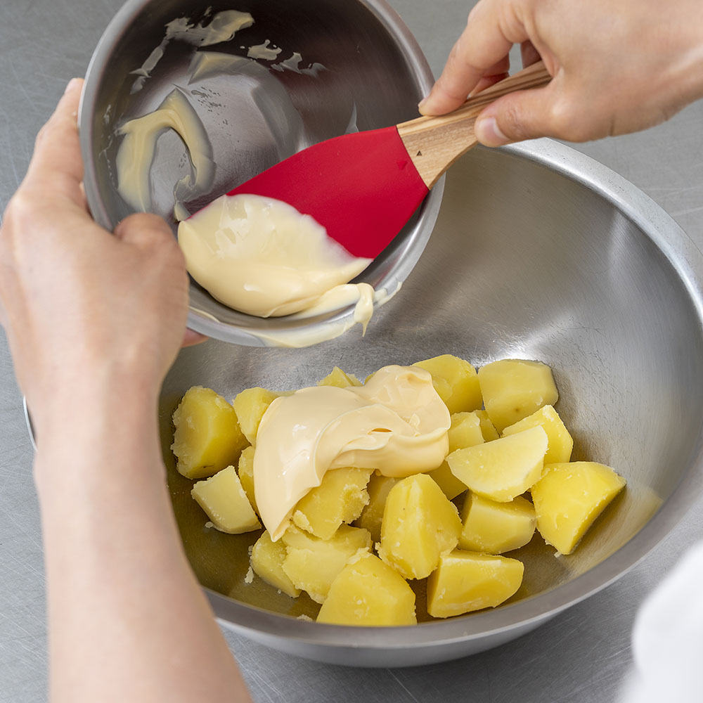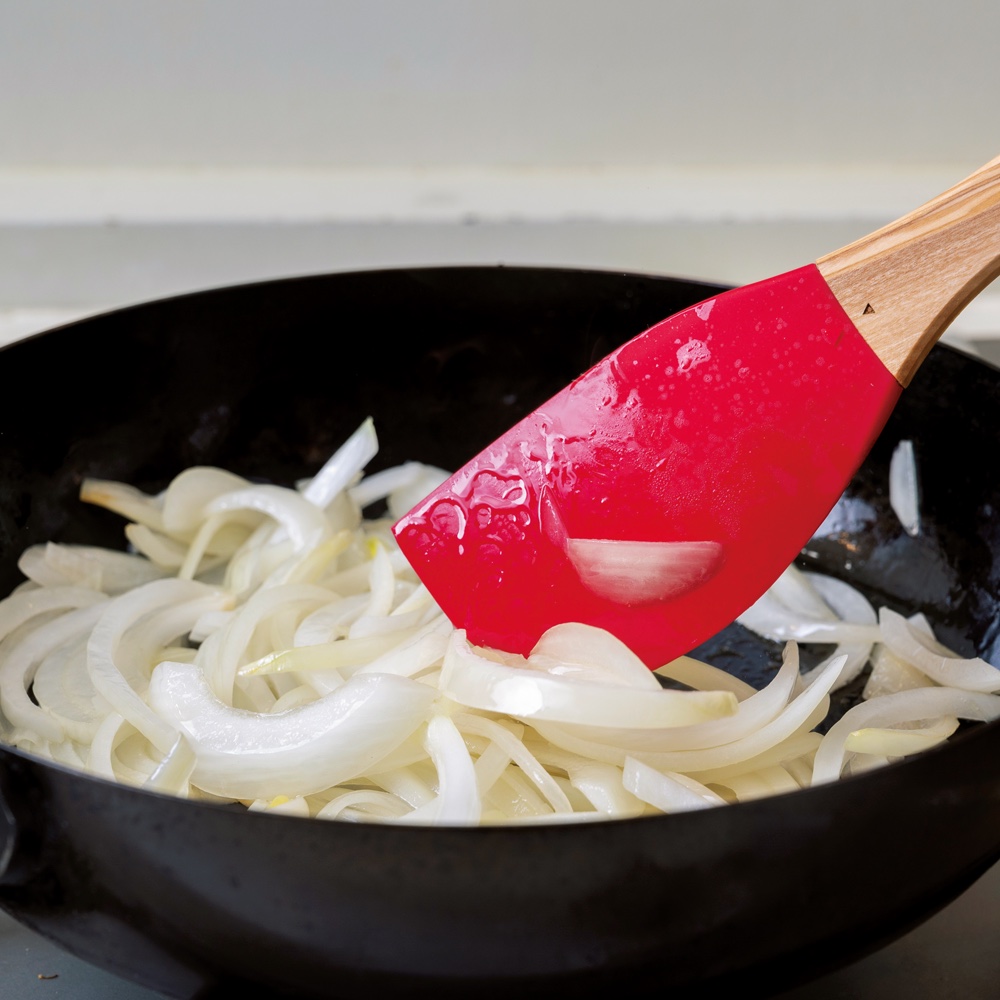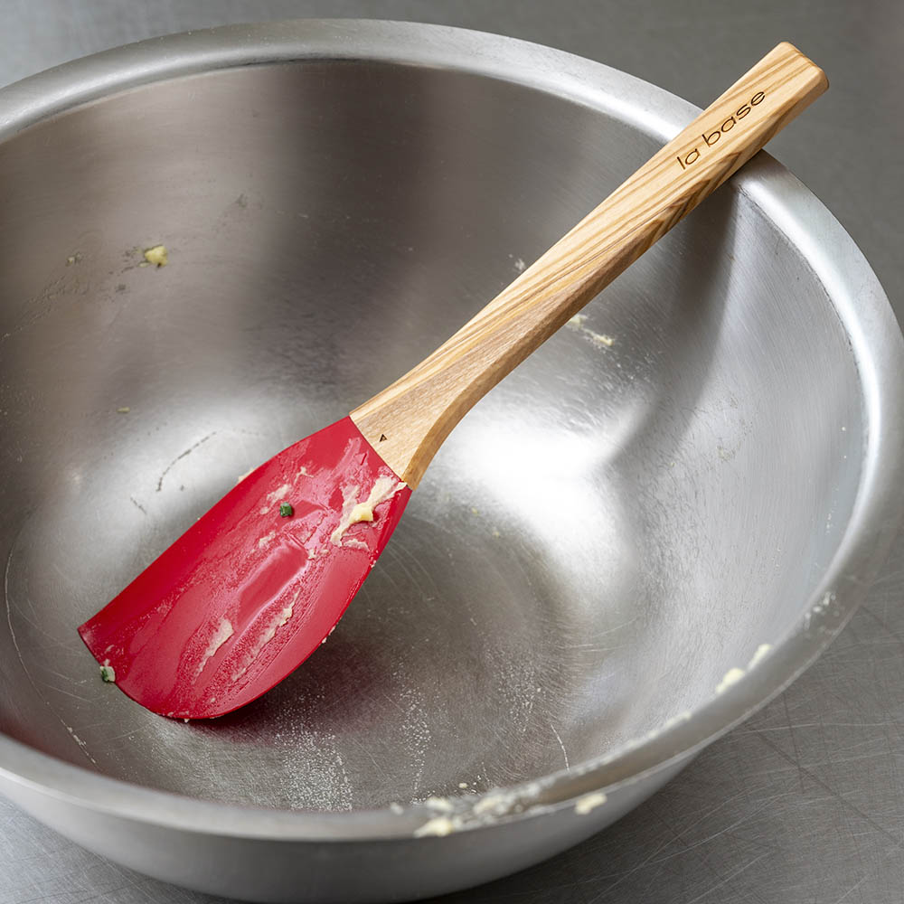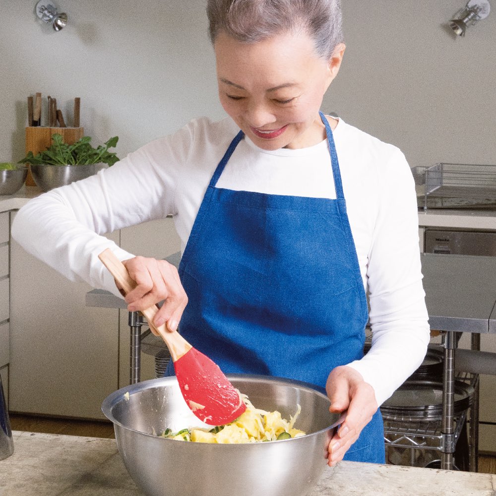 こだわりのカタチも硬さも全てがお料理をキレイに混ぜあわせたり、キレイに取るため。「これが硬すぎたりとかカタチがおかしかったりすると取れない。途中であきらめて、洗ってしまうともったいないんです。もう本当にキレイに取れるということがすごく大事なんです。」と語る有元さん。ちょうどいい硬さをもとめて完成したこのシリコーンヘラを「気持ちよくお料理したい人に是非」使っていただきたいと考えています。商品画像の説明