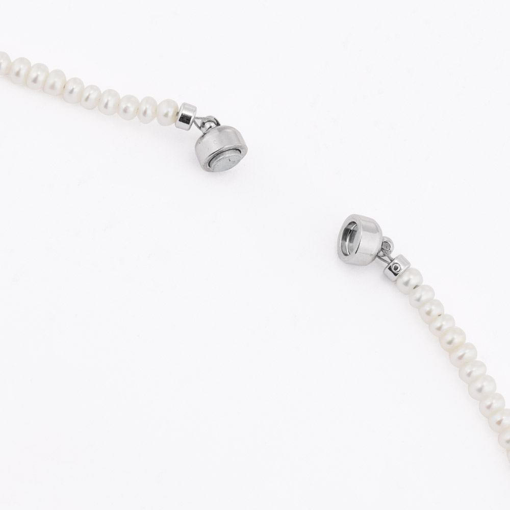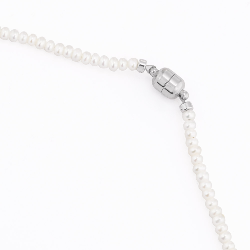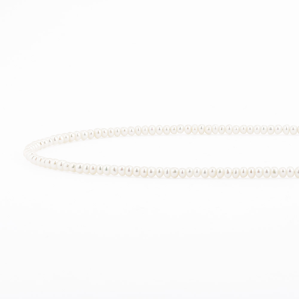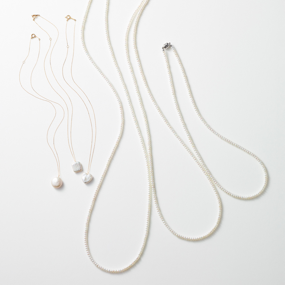ベビーサイズの淡水パールを連ねた愛らしいデザイン。90cm・120cmは2連にすれば、より華やかにアレンジ可能。マグネット式の留め具でストレスフリーに。商品画像の説明