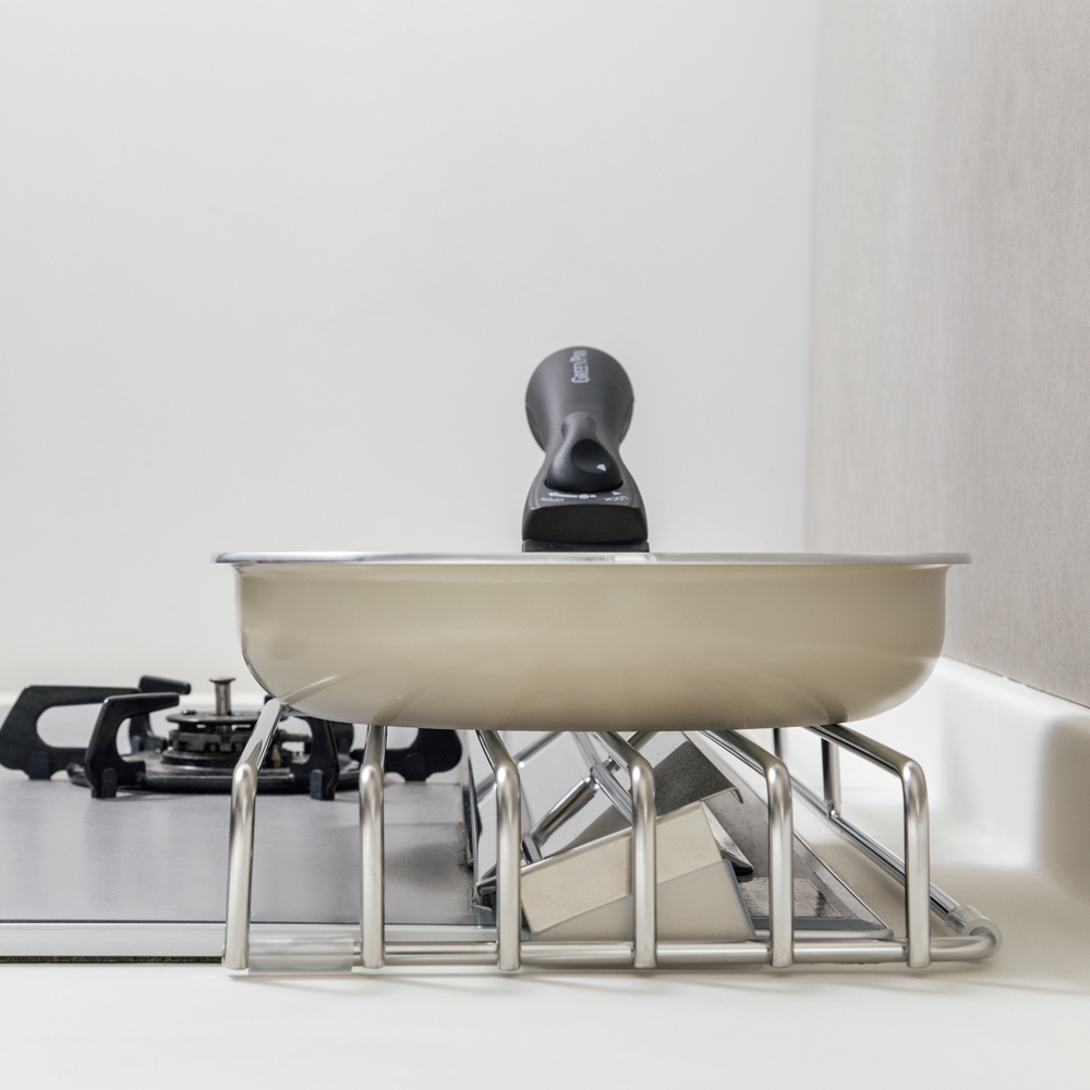 耐荷重はなんと20kg!極太の直径6mmのワイヤーを使用し、食材の入った重たい鍋や人気のホーロー鍋、直径30cmの大型フライパンも難なく置けます。すべての部材に、水回りアイテムによく使われる、サビに強く耐蝕性・耐久性に優れた18-8ステンレスを使用。18-8ステンレスは、機械の耐久部品等にも使われるほど、ステンレスの中でも錆びにくい素材のため、濡れたままのツールや高温のお鍋を置いても大丈夫。仮置きスペースを作ることで、空いたコンロで次の料理を作れ時短にも。