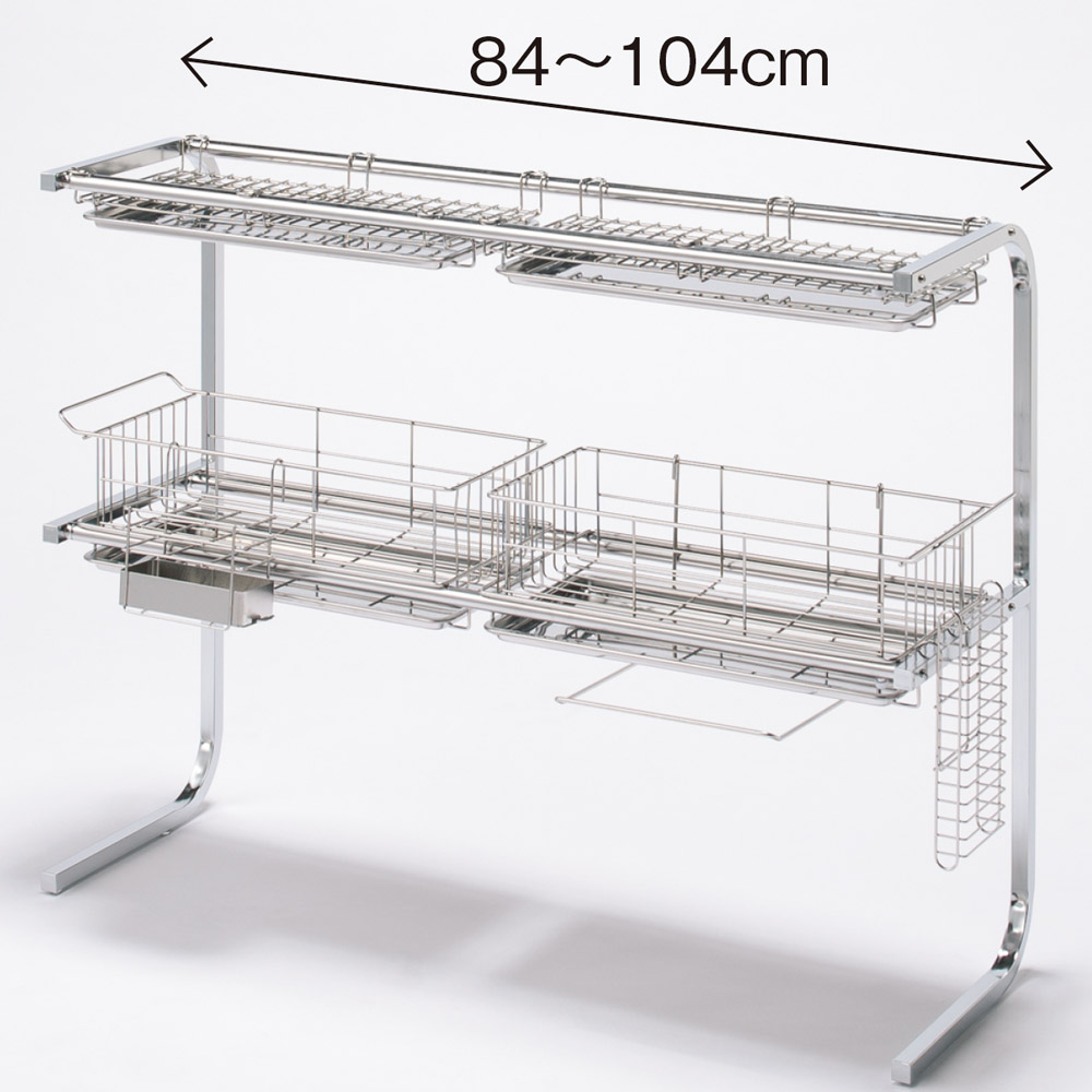■サイズ:幅84~104(包丁ホルダーは含みません。包丁ホルダーを含む場合の幅は87.2~107.2cm)奥行27高さ65cm バスケット内寸(1ヶ所につき)幅37奥行16.7深さ9.7cm 全体耐荷重10kg