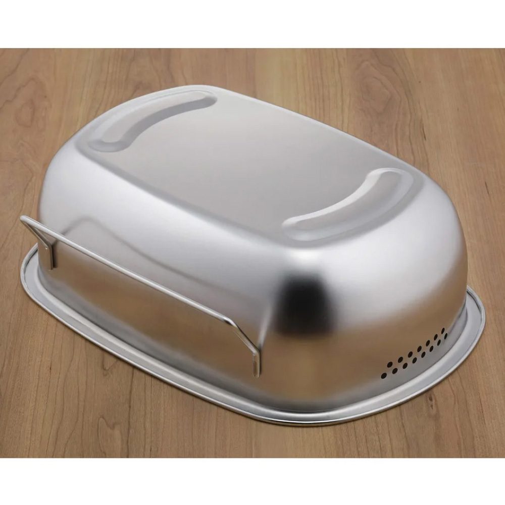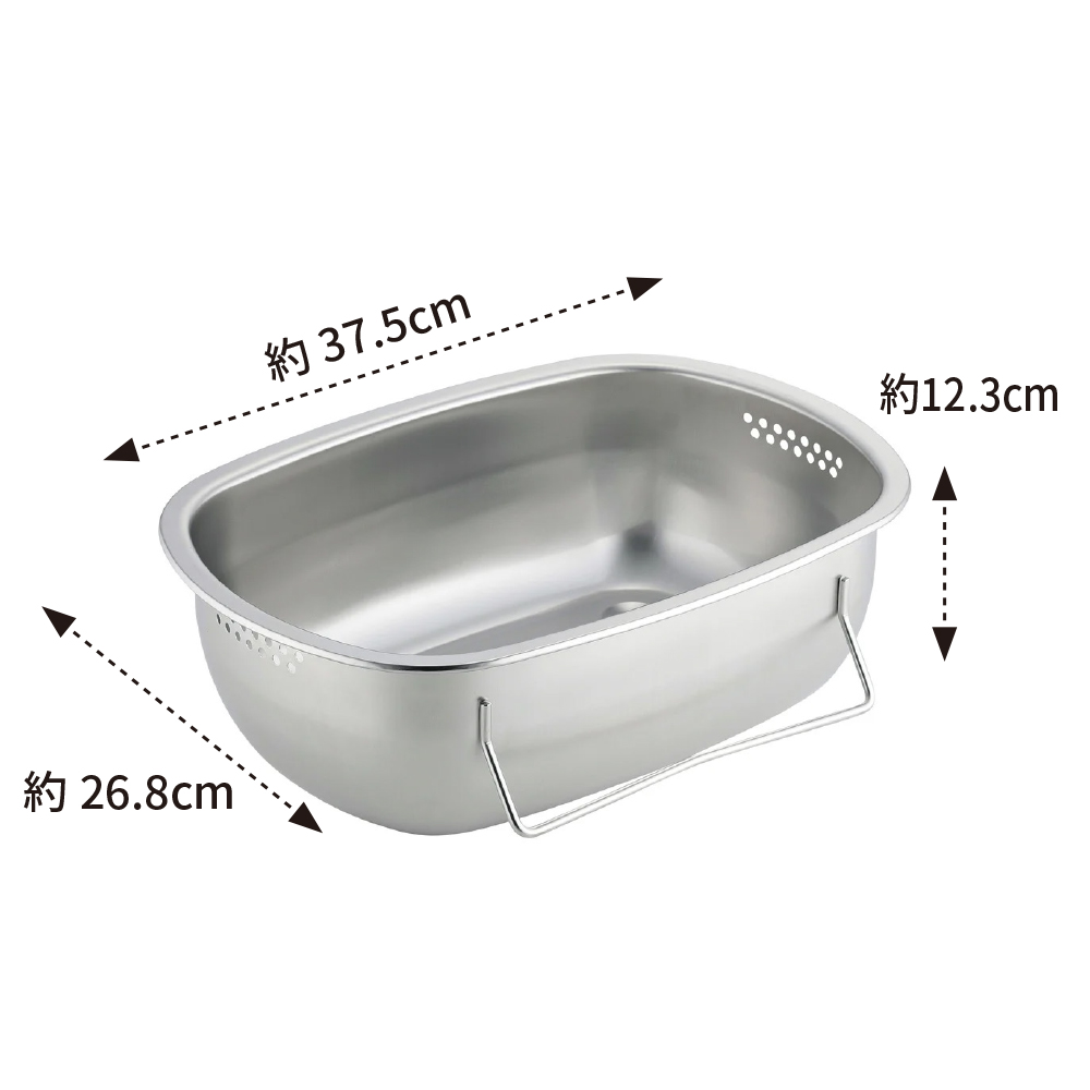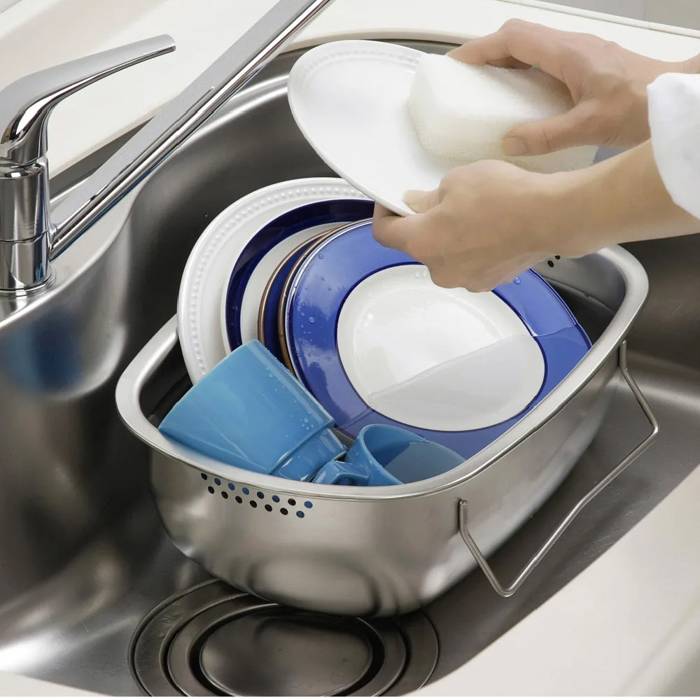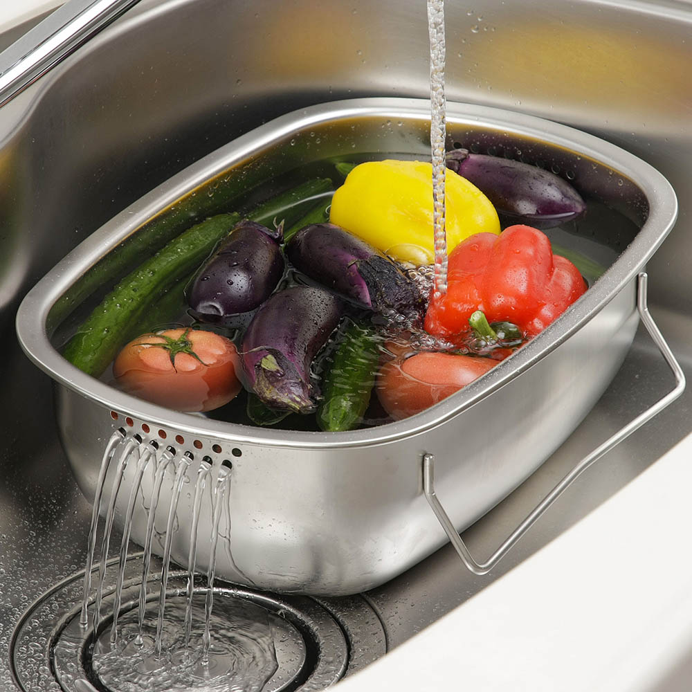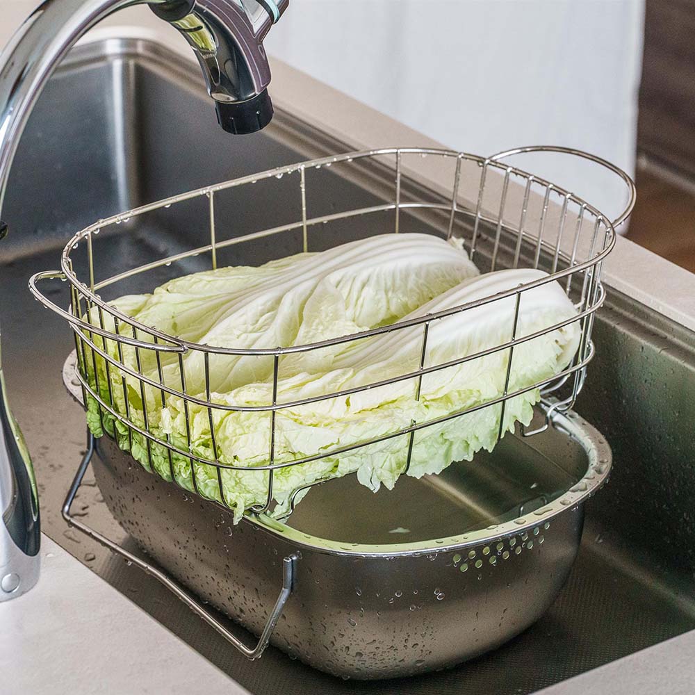 白菜やホウレン草などの大きめ野菜やたくさんの果物を洗いたいときは、家事問屋「水切りかご」とのセット使いがおすすめ。かごを持ち上げるだけで簡単に水切りができます。