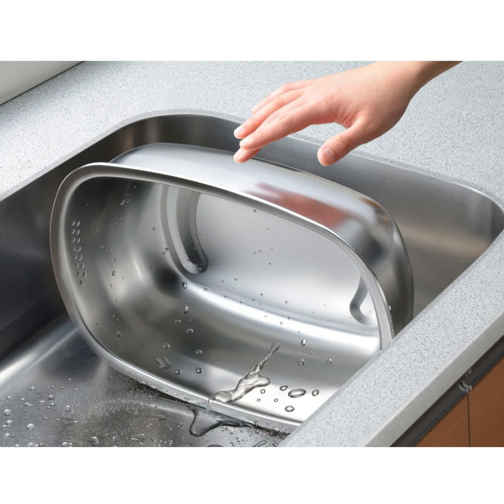 使用後は立てて置けるので省スペースで収納が可能。作業台に置いてもジャマになりません。オールステンレス仕様だから、ぬめりにくく衛生的に保てるのもうれしいところです。