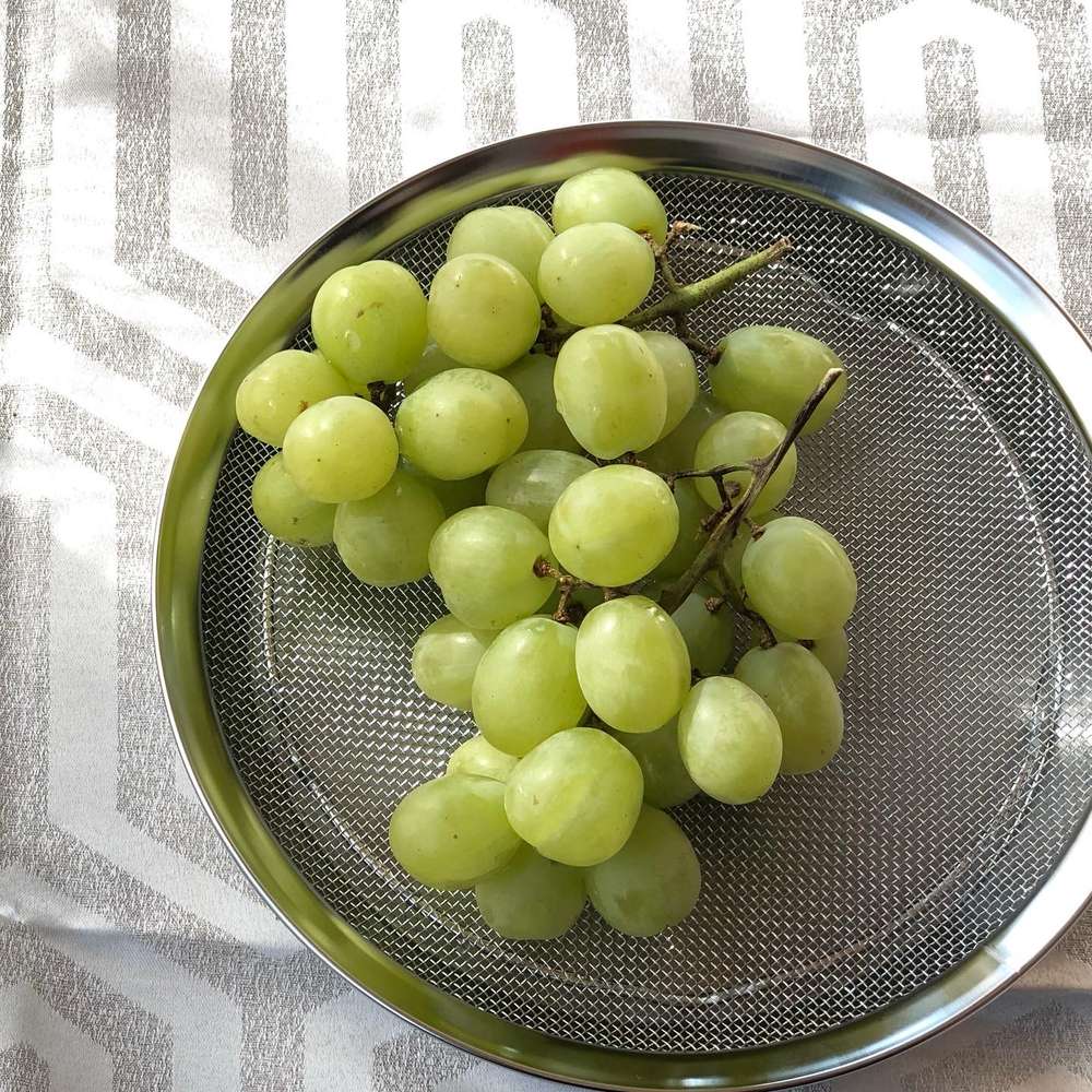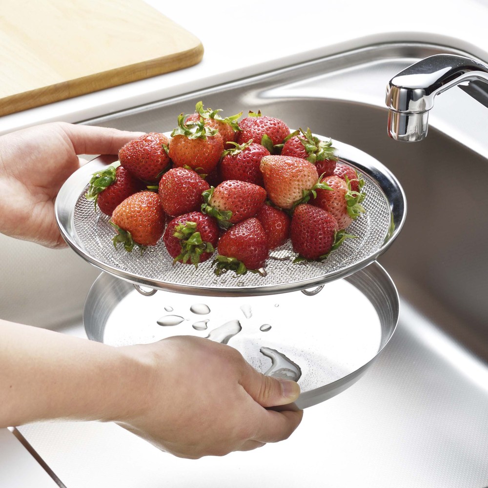 ●盆ザルでフルーツを洗ったら、まる型トレーに重ねてそのまま食卓へ。