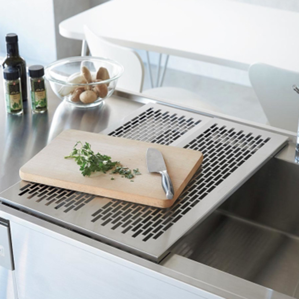 調理中に「もう少し作業スペースが広かったら…」そんな思いを抱いた経験はありませんか?そんな方におすすめの耐荷重15kgのタフなステンレス製サポート台です。シンクに渡して設置することでキッチンの調理スペースを拡張できます。ちょっとまな板を置くスペースが欲しいときや、盛り付け時のお皿の置き場所になど、必要なときだけ便利にお使いいただけます。野菜や食器の水切りに便利な穴がポイント!