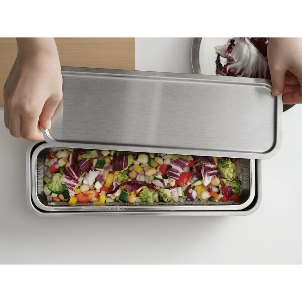 別売りのシステムトレー1/2ロングを蓋として、別売りの下ごしらえ角ザル1/2ロングをセットした状態。