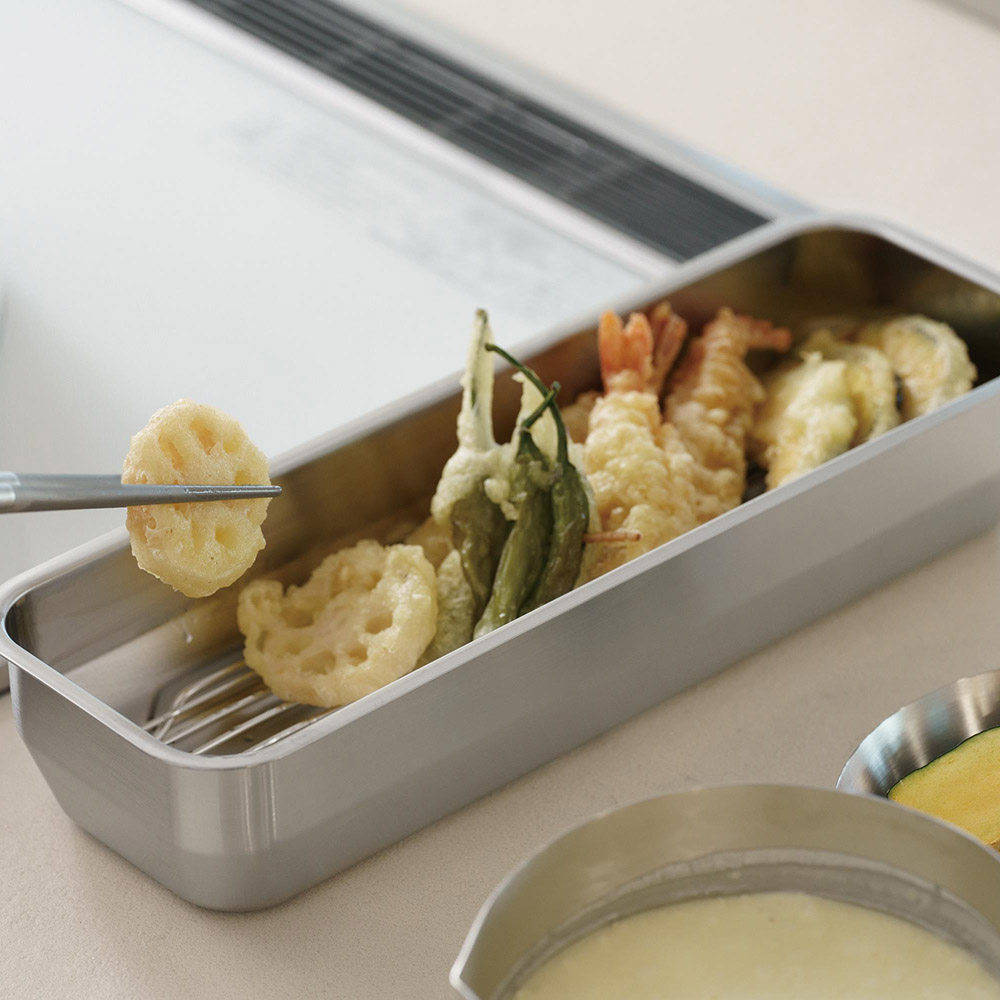 揚げ物のバットとしても便利(内側に別売りのバットあみ1/2ロングをセットしています)。