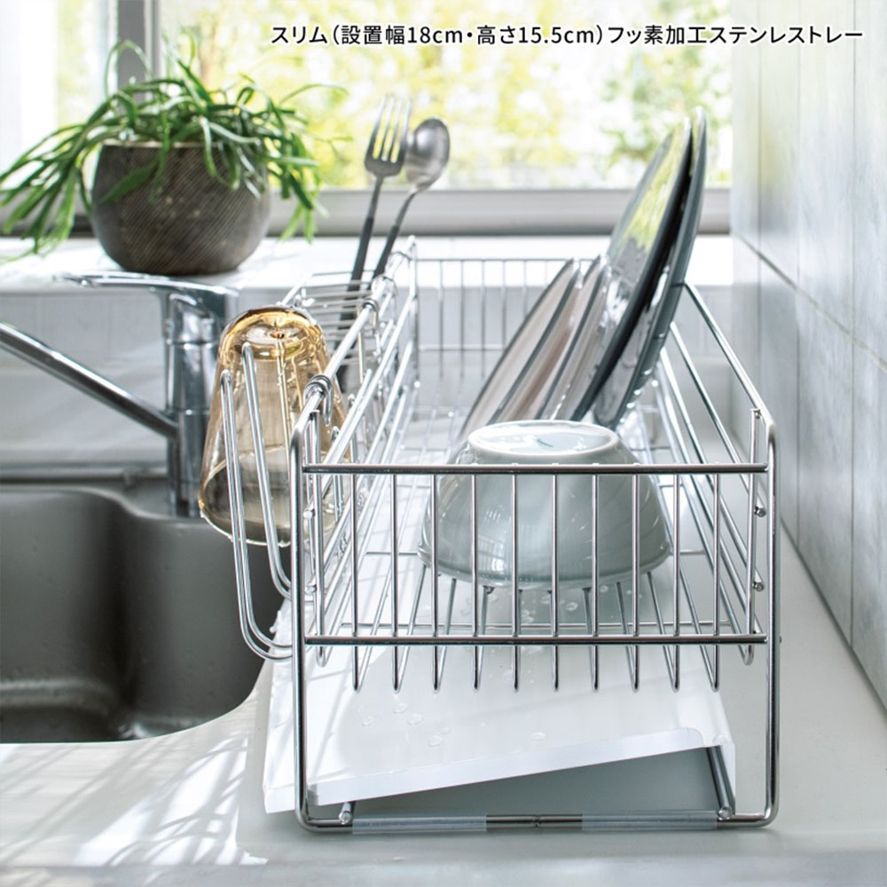 もっと水切れよくとのご要望から生まれた「フッ素加工ステンレストレー」は、ついた水垢も目立ちにくい白色です。