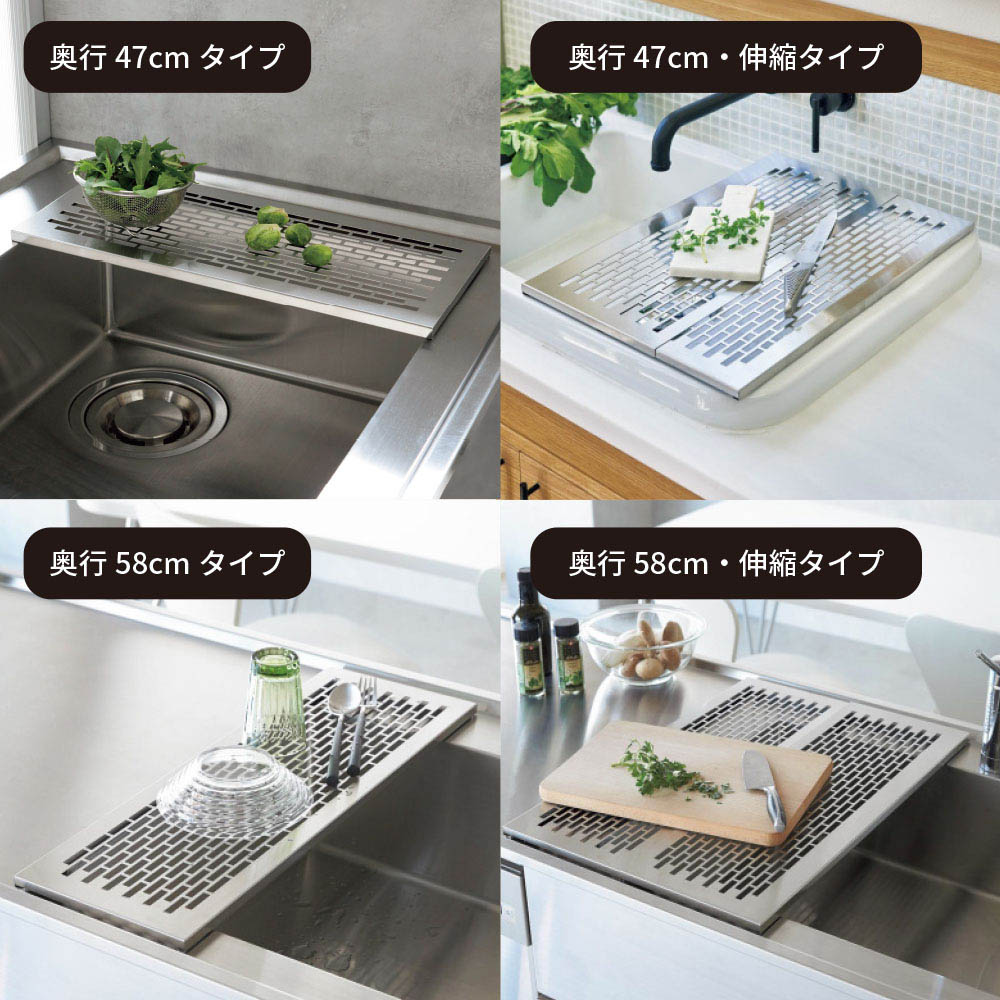 シンクの奥行に合わせて47cm、58cmの2サイズがあります。幅は20cmまたは21~38cmの伸縮タイプから選べます。