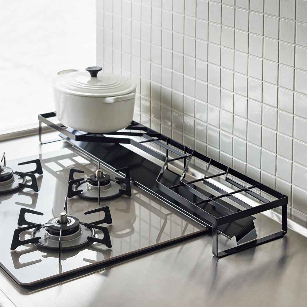 「コンロ奥のデッドスペースをもっと有効活用したい!」そんな方におすすめしたい、まるで造り付けのようなデザインと重厚感のあるブラックで、コンロ奥スペースを有効活用できるコンロ奥ラックです。さらに「グリル排気口が汚れちゃうのをなんとかしたい!」という方におすすめの、排気口カバー付きもラインアップ。すっきりきれいなキッチンを実現できます。耐荷重20kgの頑丈さが魅力