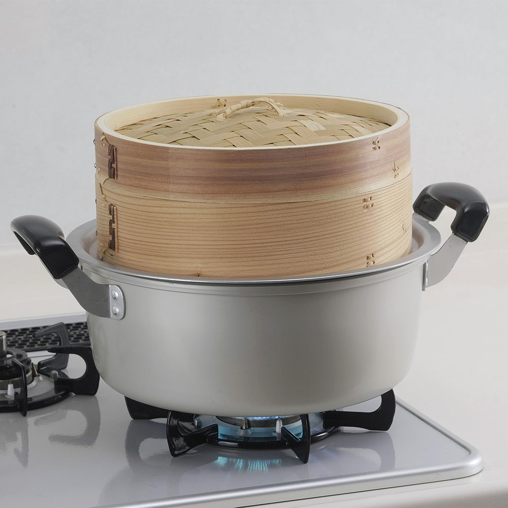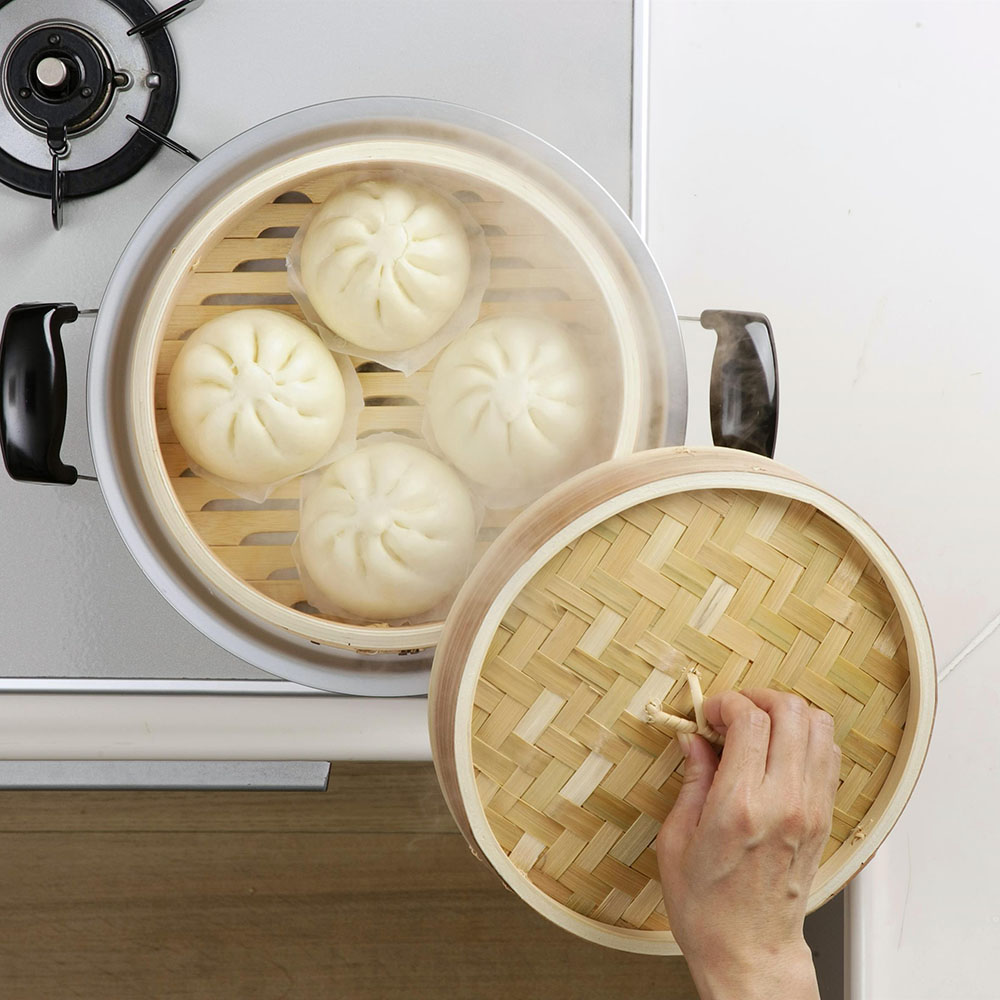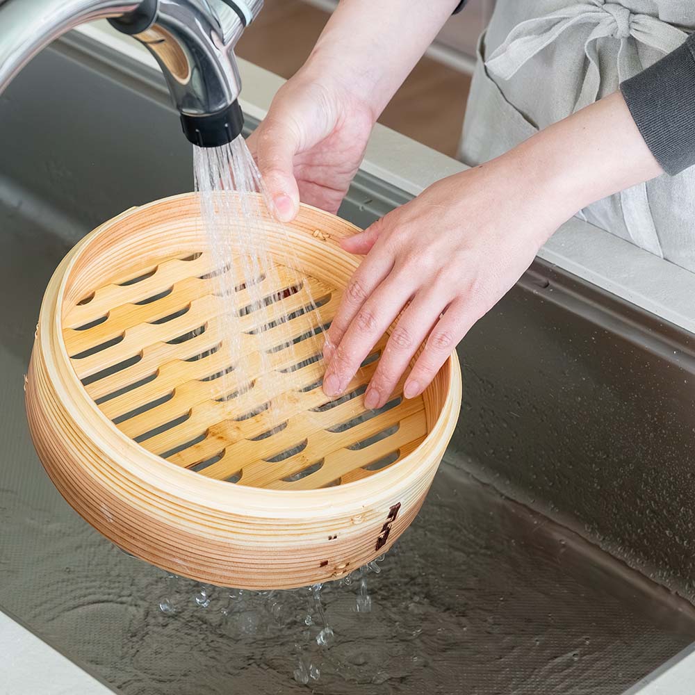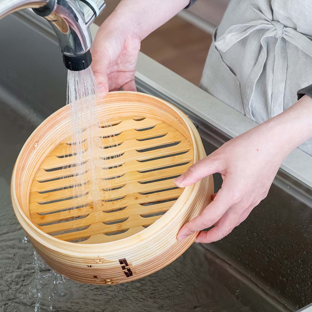 セイロで蒸したシュウマイ、中華まんはふっくらと仕上がり、格別においしさが増します。野菜も茹でるよりも甘味が残っておいしくいただけますし、油で炒めるよりもヘルシーです。セイロごと食卓に出せば見た目にも豪華でおもてなしにもおすすめです。業務用としても使われているセイロで、芯材に竹を挟むことで強度を上げていて丈夫です。一般的な中華まん4個が入る大きさです。※使用後は極力洗剤を使わずにタワシなどで十分に汚れを取り除き、しっかり乾燥させてから保管してください。