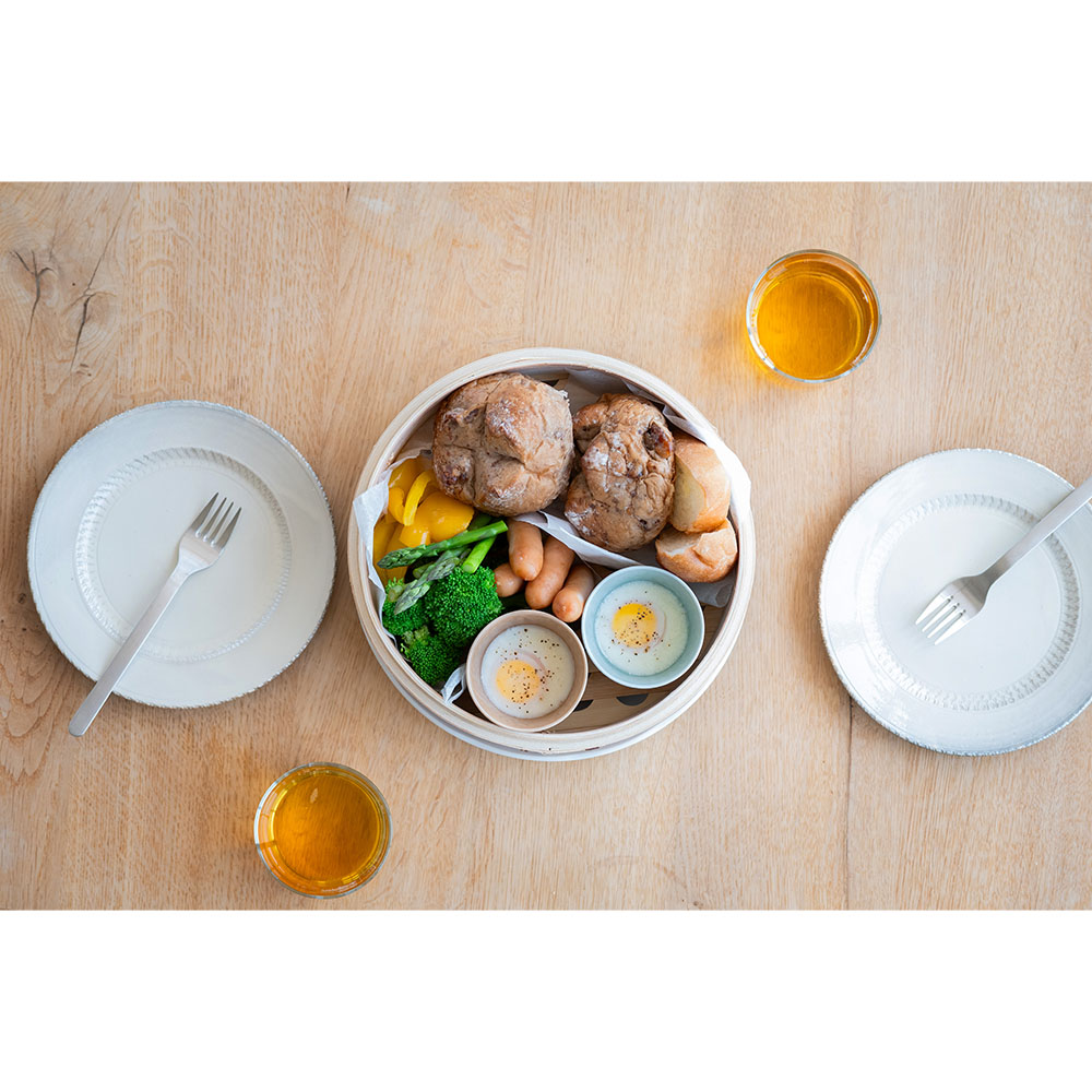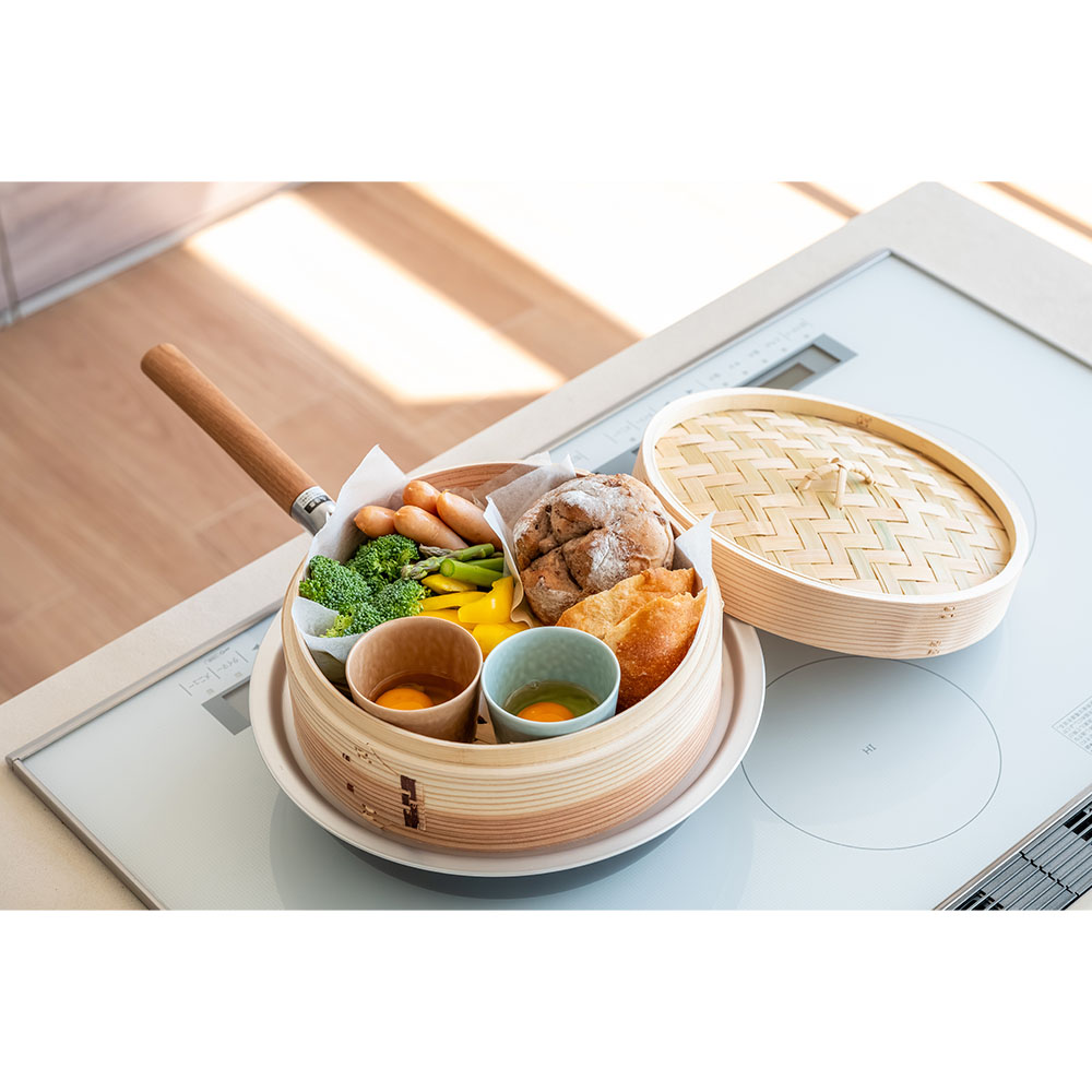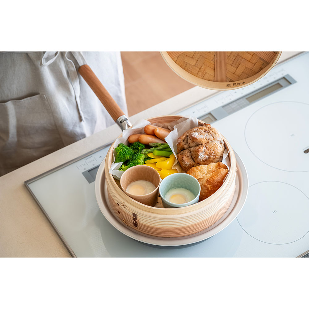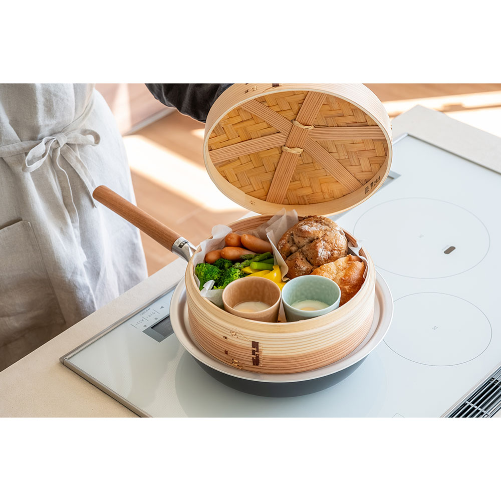 セイロで蒸したシュウマイ、中華まんはふっくらと仕上がり、格別においしさが増します。野菜も茹でるよりも甘味が残っておいしくいただけますし、油で炒めるよりもヘルシーです。セイロごと食卓に出せば見た目にも豪華でおもてなしにもおすすめです。業務用としても使われているセイロで、芯材に竹を挟むことで強度を上げていて丈夫です。一般的な中華まん4個が入る大きさです。※使用後は極力洗剤を使わずにタワシなどで十分に汚れを取り除き、しっかり乾燥させてから保管してください。