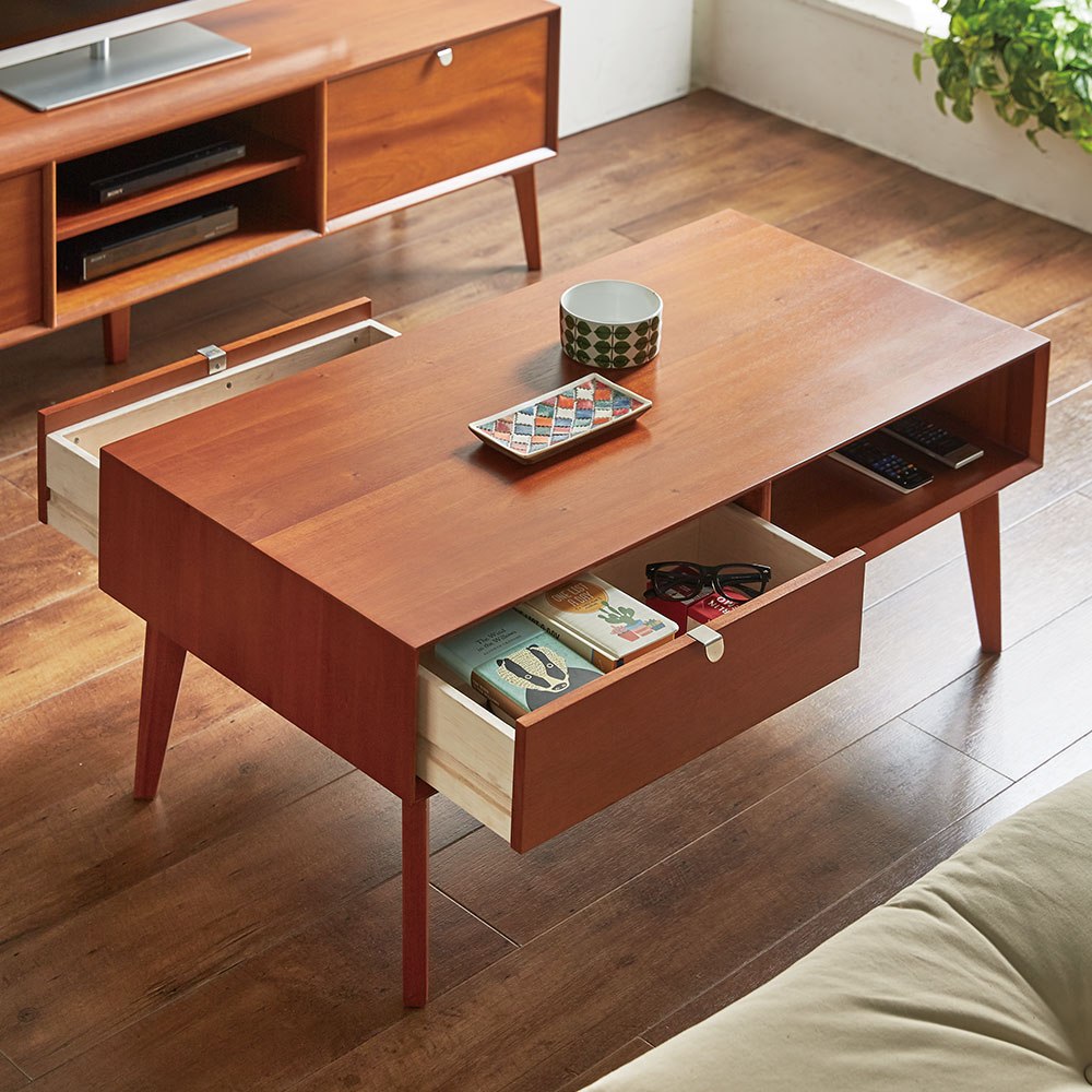 テーブル下の棚と引き出しに、リモコンやリビング小物などをすっきり収納。引き出しは両サイドから出せます。