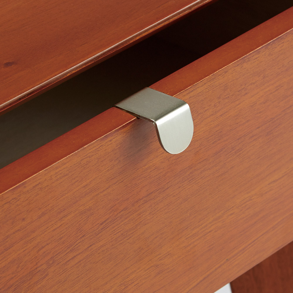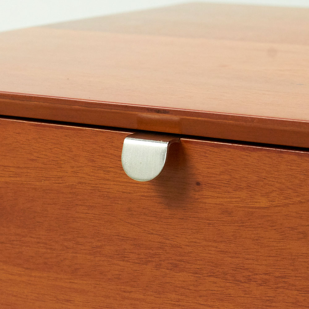 ■シルバーに光る取っ手は真鍮を採用しました。ヴィンテージな質感を出すため、表面をマットな仕上げにし、優しい輝きを目指しました。■取っ手は手前に向かって斜めに傾斜するつまみタイプ。指でつかみやすいサイズ感と形で、日常の使いやすさにも配慮しました。