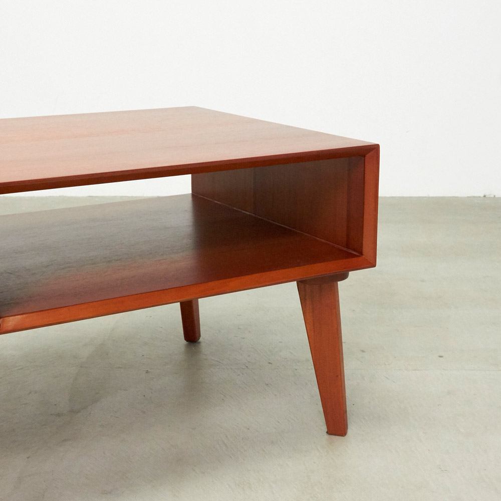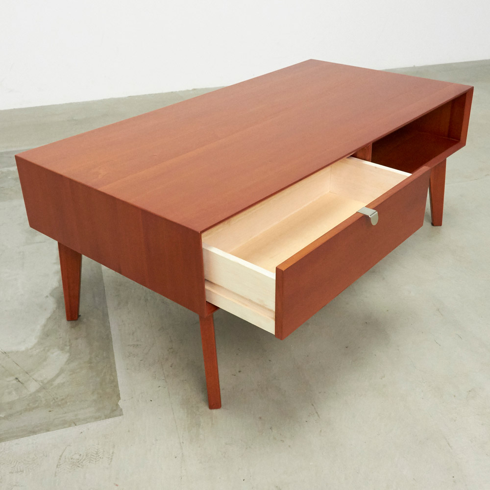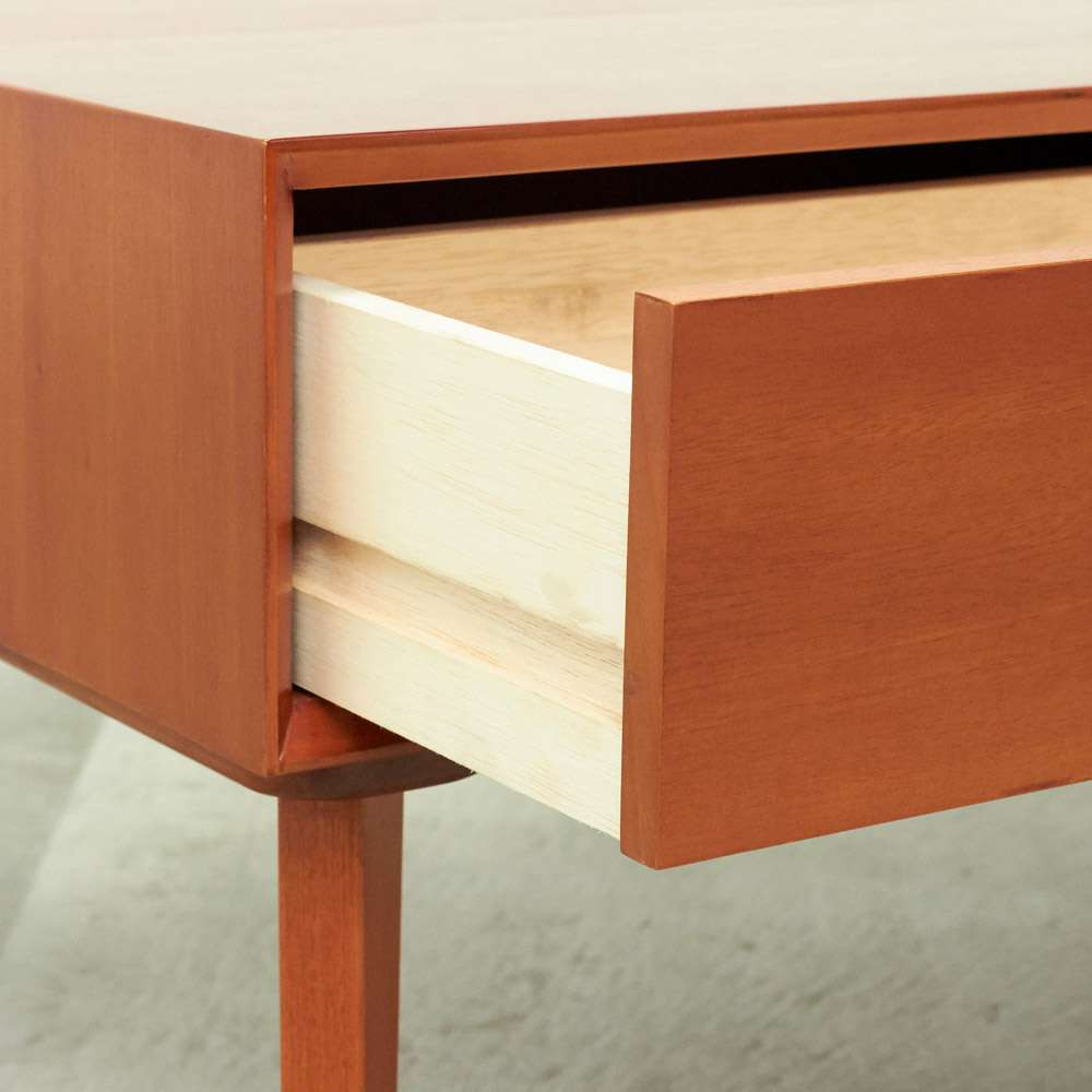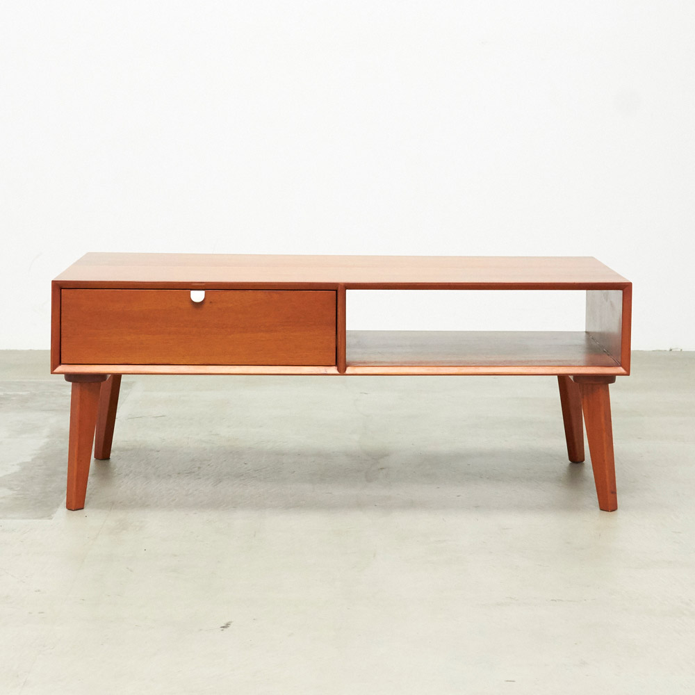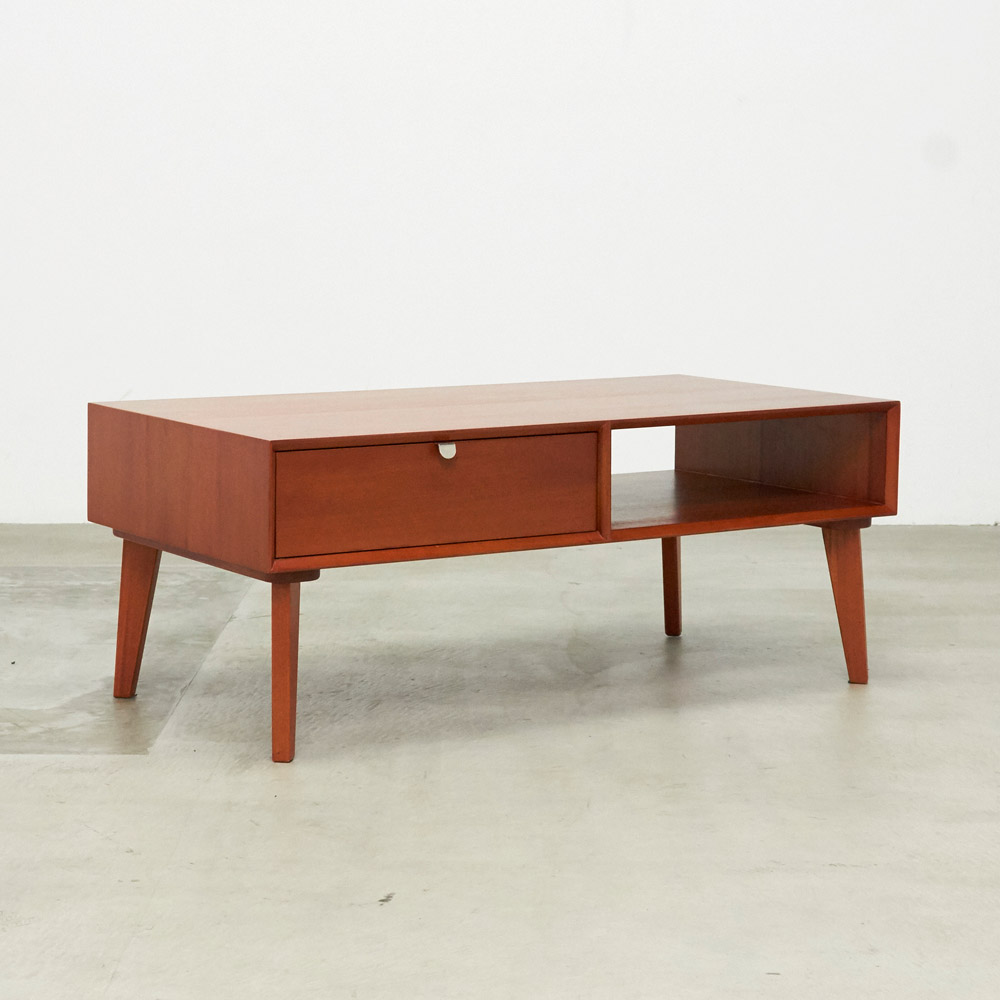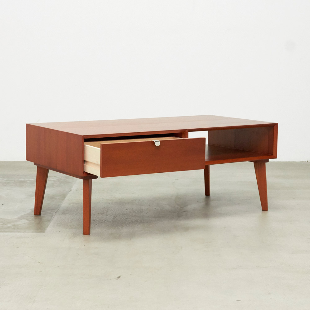 1950年代頃のデンマークによく見られる、長い脚のついた家具のスタイルをリアルに再現したシリーズ。この頃のものにみられる赤みのある色合いも丁寧に表現しました。角の仕上げから、真鍮の取っ手まで、本物のビンテージのようなインテリア空間を気軽にお楽しみいただけます。マホガニーの木目が美しいたっぷり収納のリビングテーブル
