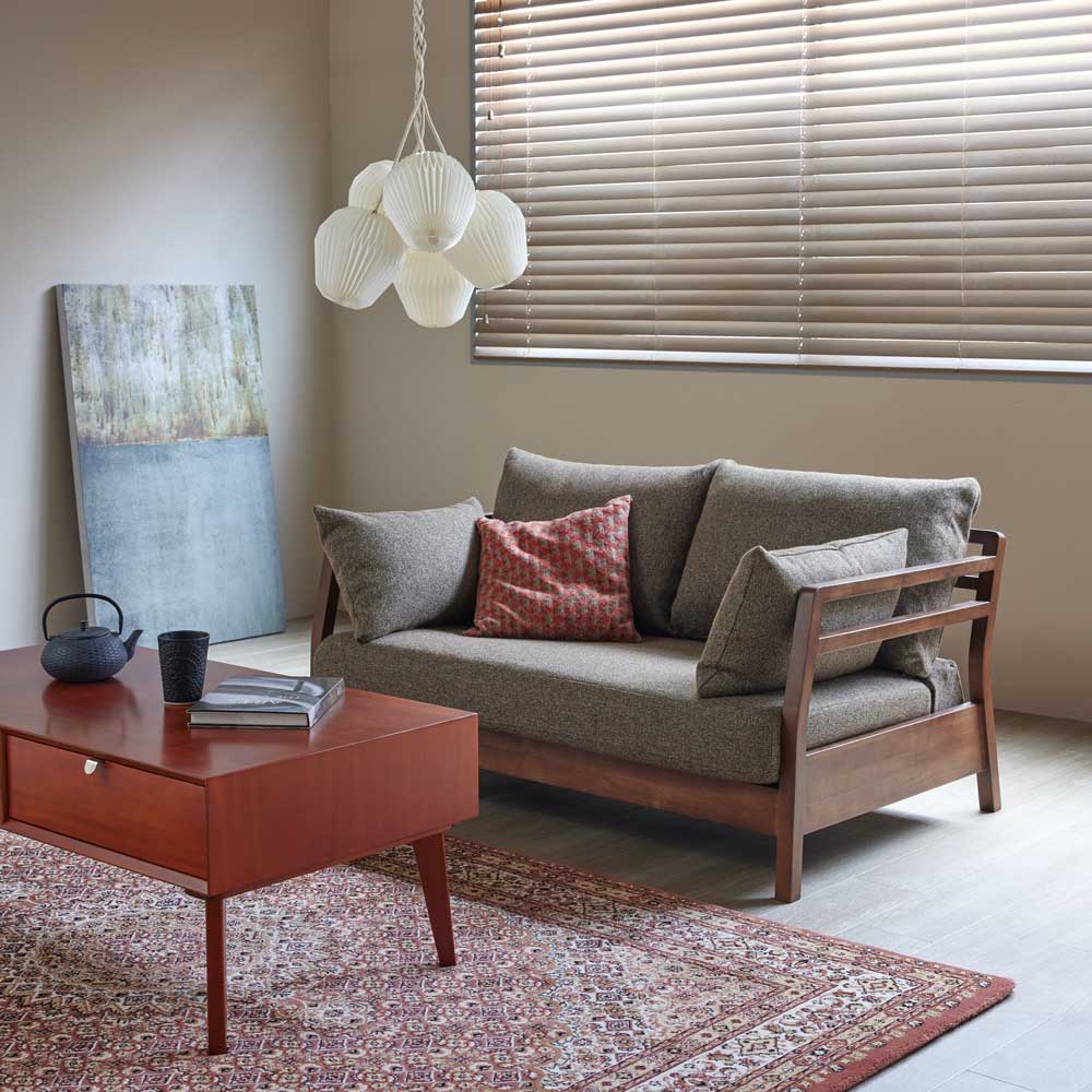 天然木製の脚が付くことで、軽やかさが同居する絶妙なデザインに。